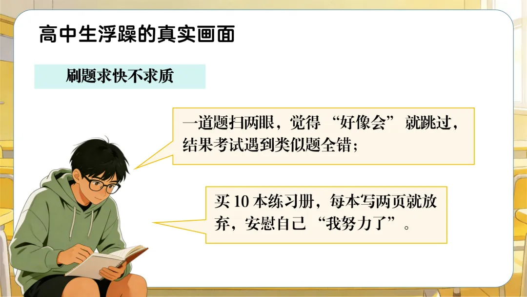 老师见过很多同学,买了10本练习册,每本写两页就放弃,还安慰自己“我努力了”;或者一道题扫两眼,觉得“好像会”就跳过,结果考试遇到类似题全错。这不是“刷题”,这是“刷存在感”啊!