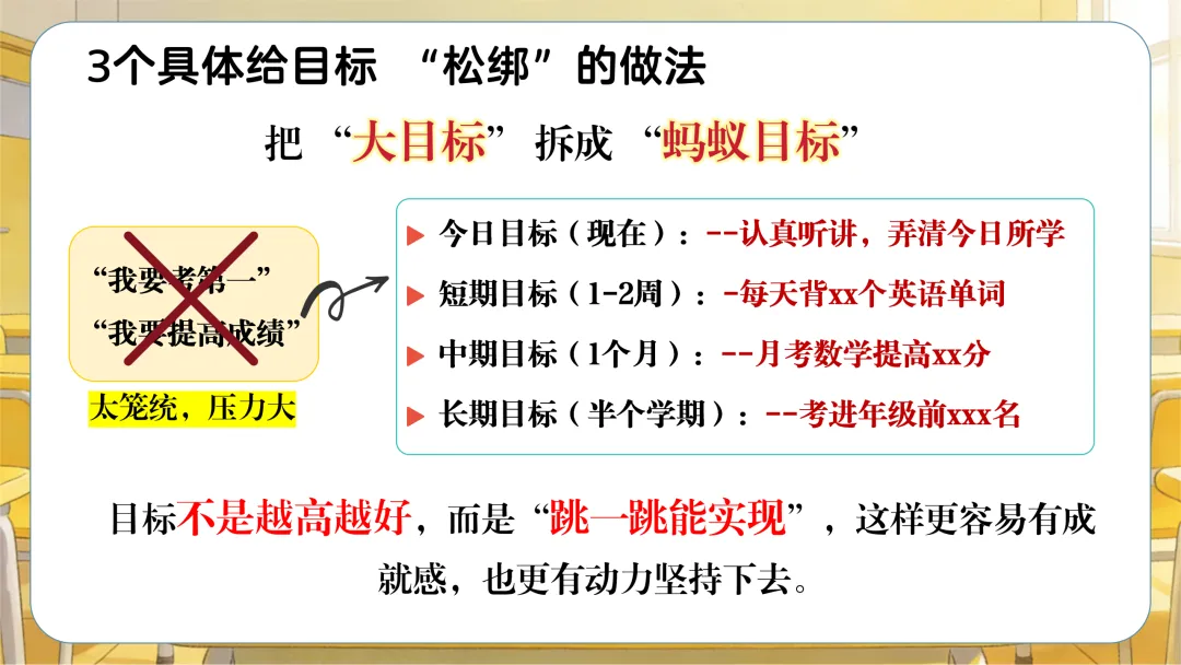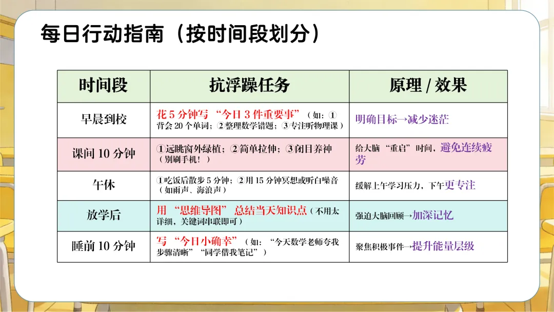 | 早晨到校 | 花5分钟写“今日3件重要事”(如:背20个单词、整理数学错题、专注听物理课) | 明确目标→减少迷茫 |