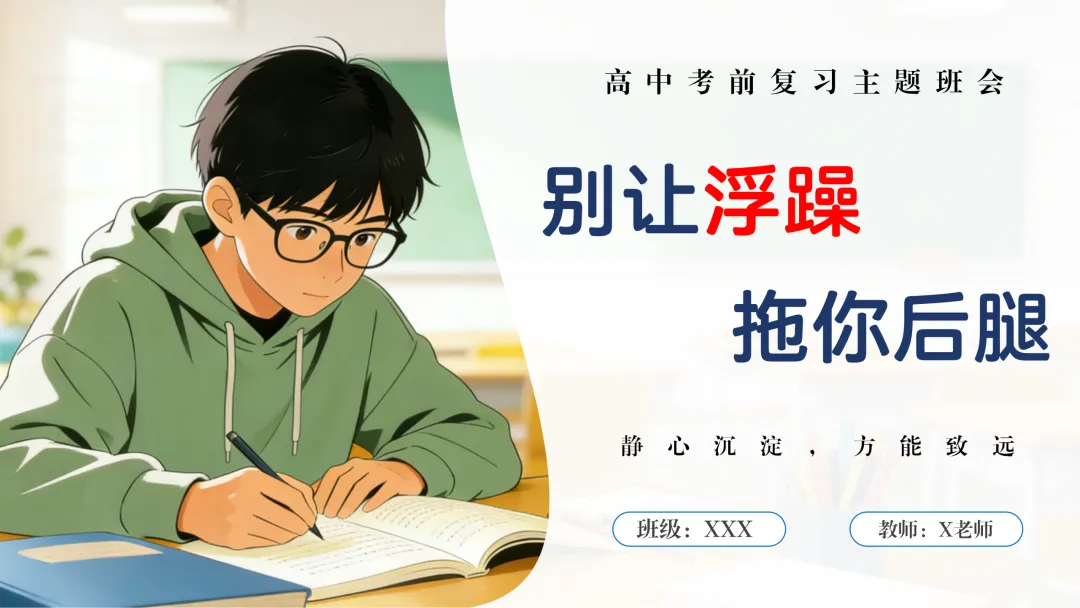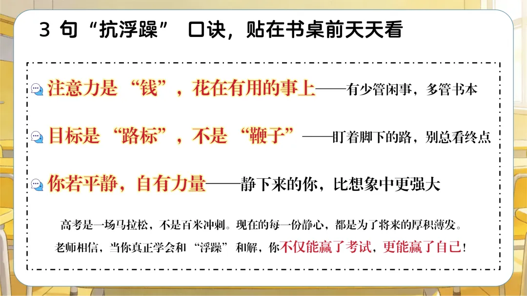 同学们,高考是一场马拉松,不是百米冲刺。现在的每一份静心,都是为了将来的厚积薄发。老师相信,当你们真正学会和“浮躁”和解,不仅能赢了考试,更能赢了自己——因为你们会明白:真正的强大,不是“从不浮躁”,而是“能快速从浮躁中走出来”。