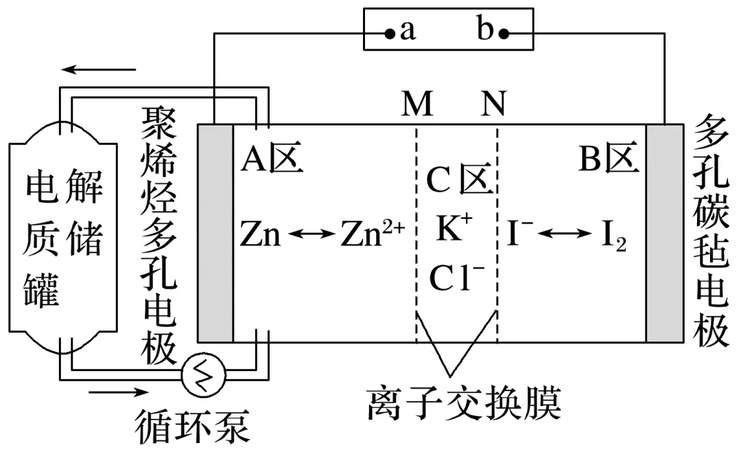 分析 | 负极:Zn-2e-===Zn2+,阳离子浓度增大,为平衡电荷,Cl-移向A区,M为阴离子交换膜; 正极:I2+2e-===2I-,阴离子浓度增大,为平衡电荷,K+移向B区,N为阳离子交换膜 |