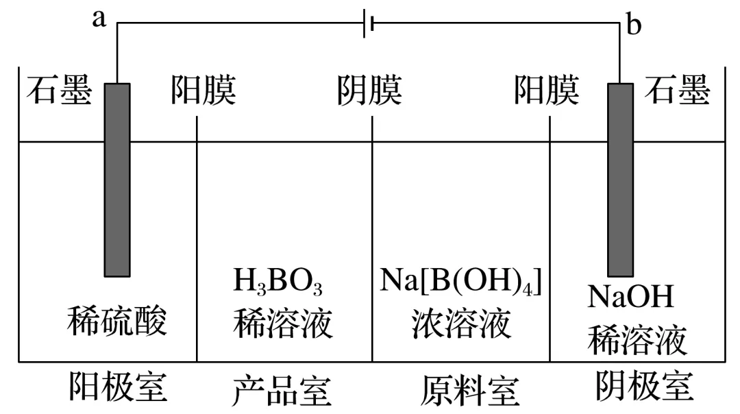 原料室 | [B(OH)4]-穿过阴膜进入产品室,Na+穿过阳膜进入阴极室 |