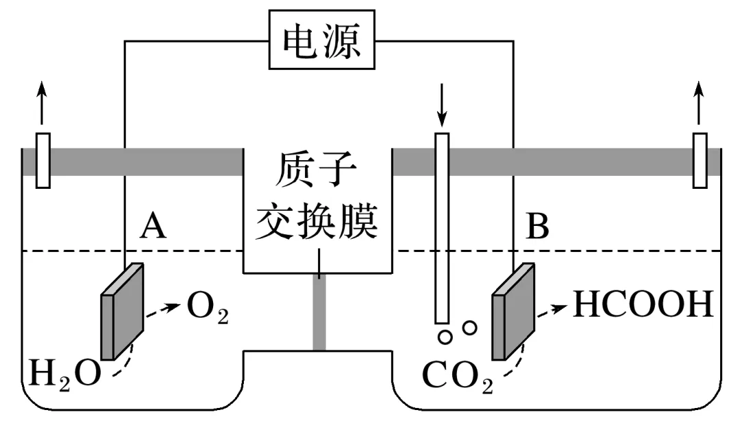 解析电极B是阴极,则电极反应式是CO2+2e-+2H+===HCOOH。