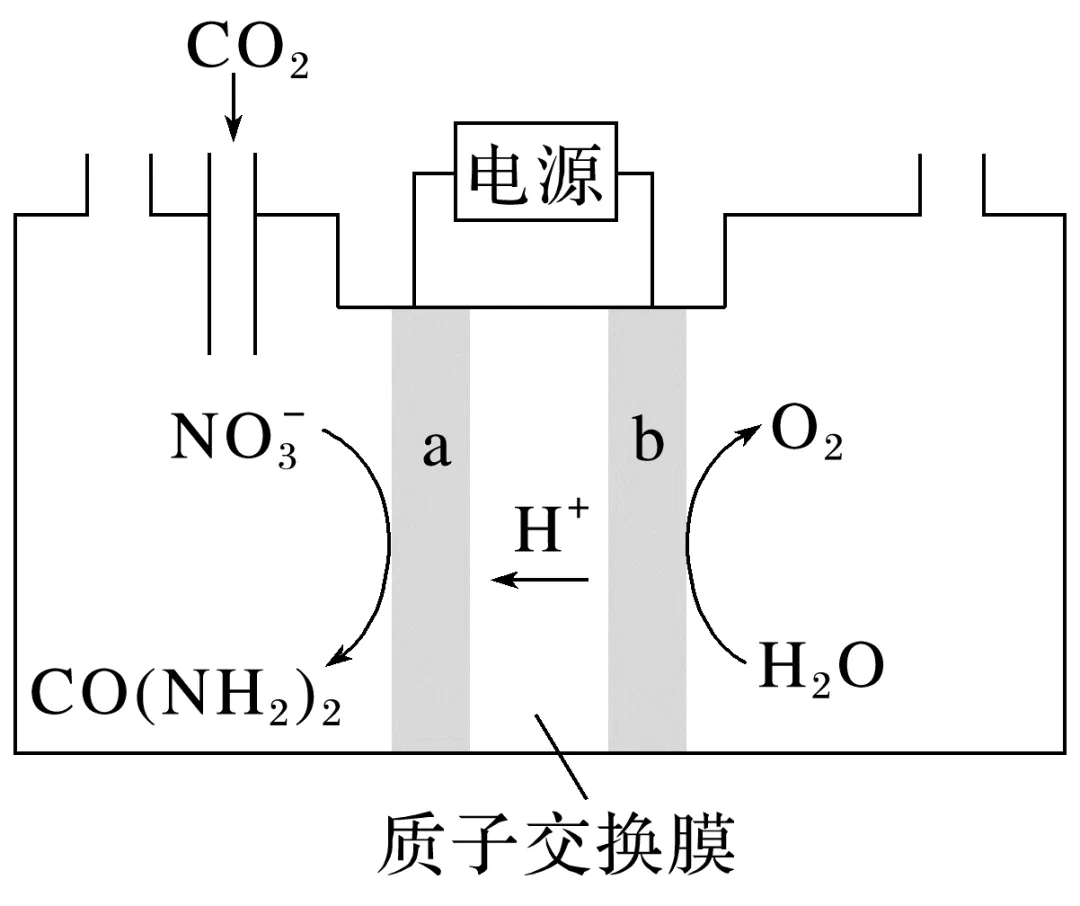 解析①电极b上发生H2O失电子生成O2的氧化反应,是电解池的阳极。②a极硝酸根离子得电子转化为尿素,再结合酸性环境可分析出电极反应式。