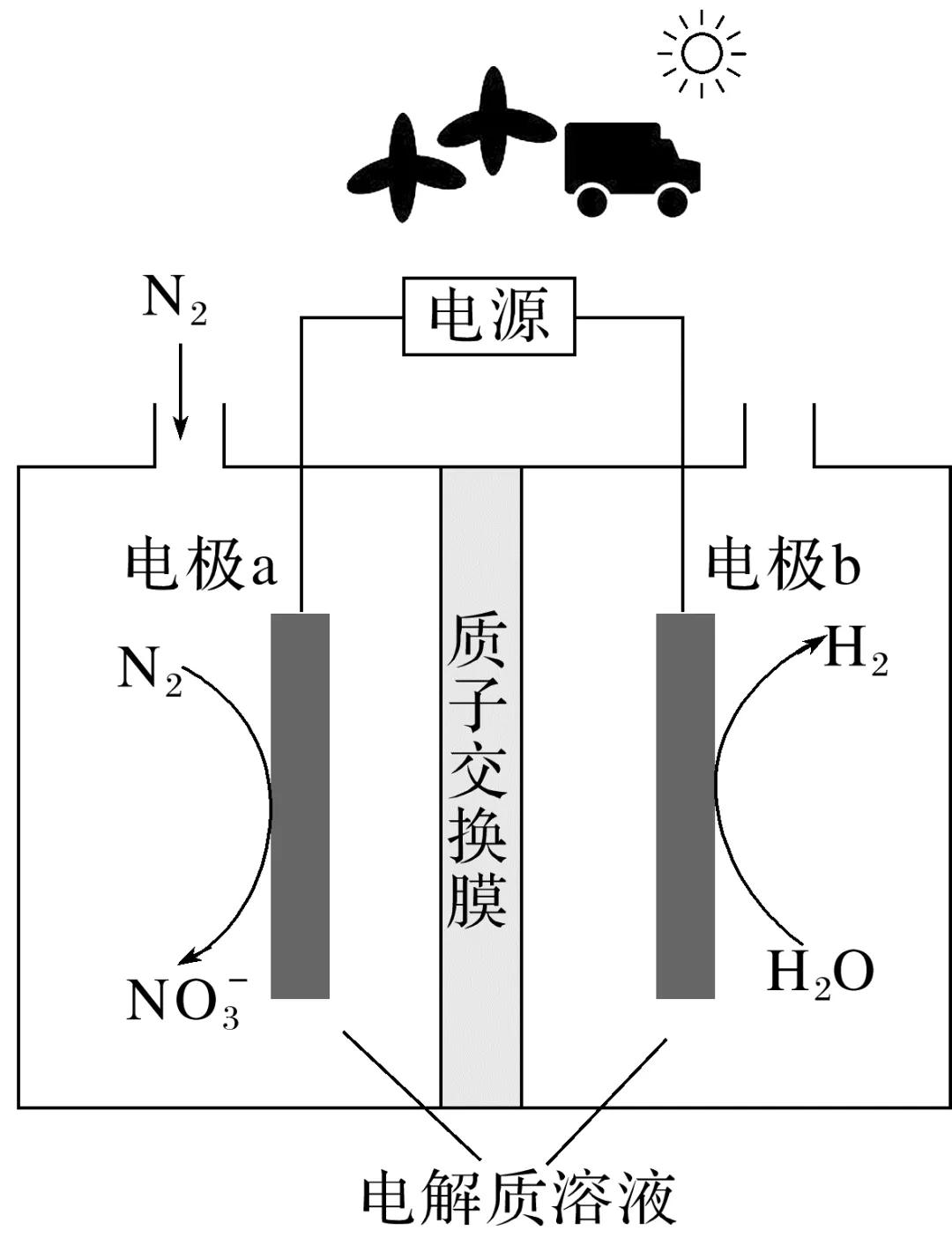 ,氮元素化合价升高,发生氧化反应,电极a为阳极,电极反应式为N2+6H2O-10e-===2N