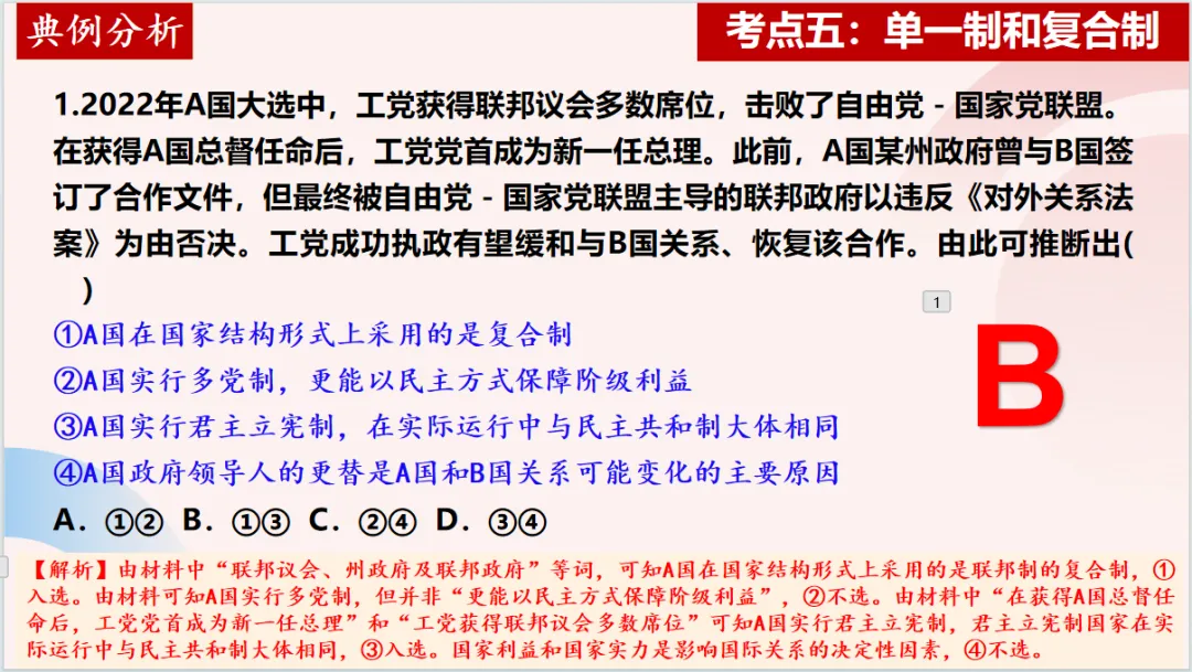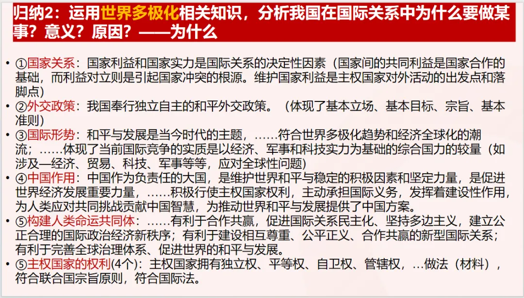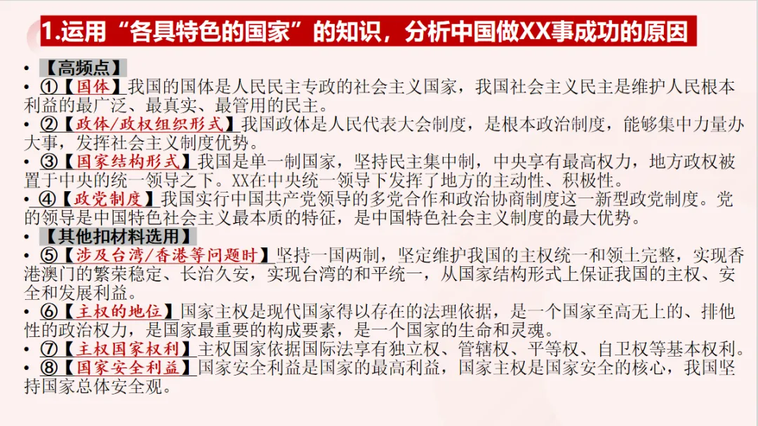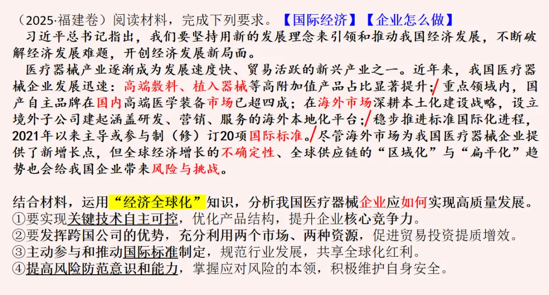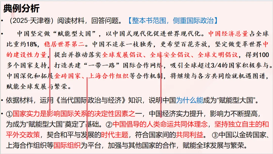 课件里每类主观题都配有典型的例题分析。光讲模板是空的,必须带着学生真正做一遍——怎么看设问、怎么找材料关键词、怎么把模板和材料结合起来。只有讲透一道题,学生才能真正明白:哦,原来这个模板是这么用的。