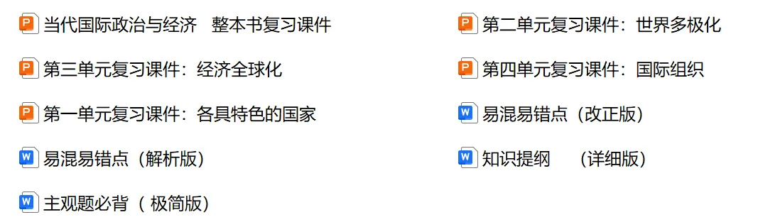 这份资料的整理,源于我自己的教学刚需,下周就要进行高二下的第一次月考,考试范围刚好是选必一《当代国际政治与经济》整本书。如果有老师刚好和我的进度同步,那这套资料直接拿去就能用,省心省力!