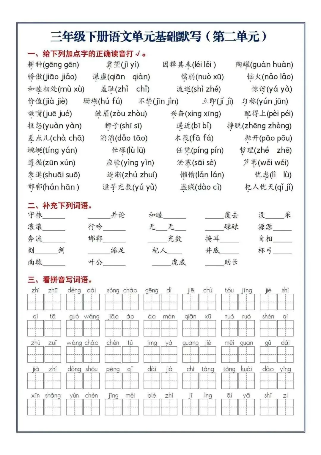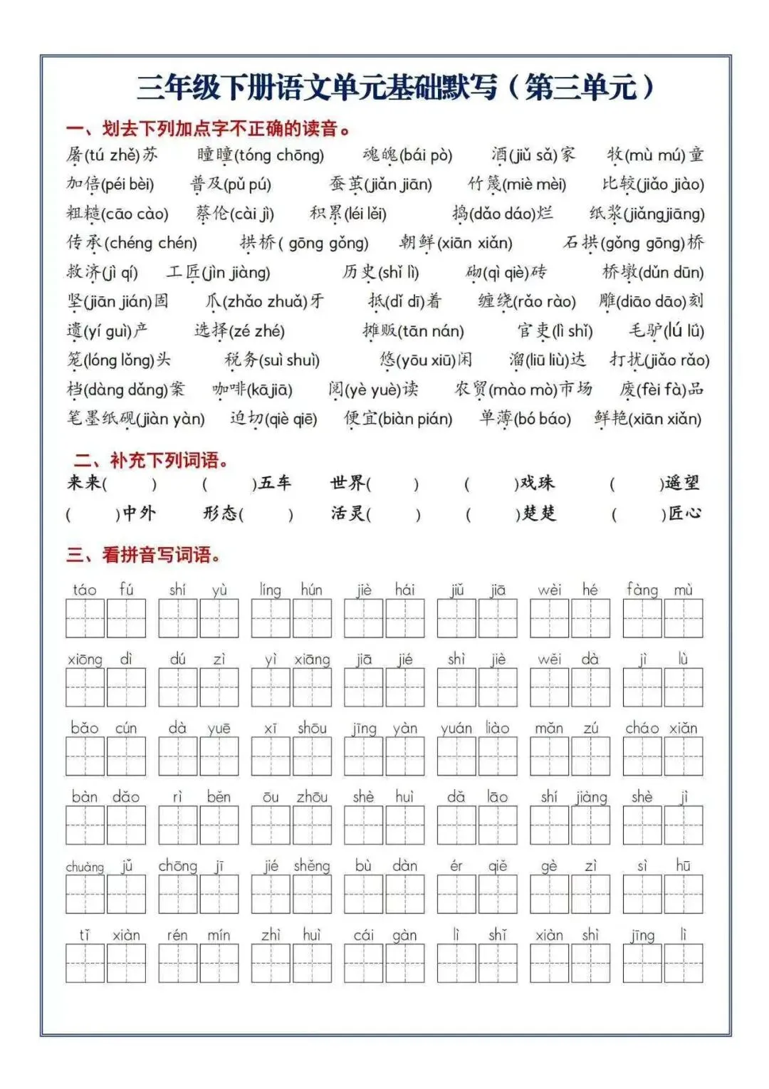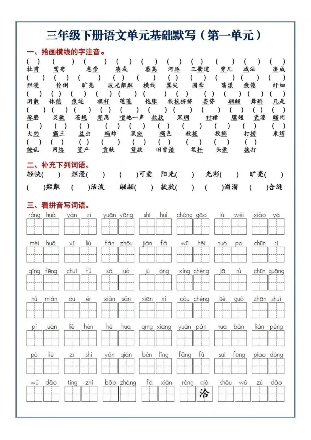 给大家分享一份特别全的单元默写练习资料,就是针对三年级下册语文的。内容是真扎实,你看啊,拼音写词语、形近字组词、近反义词、成语填空这些都有,还把古诗和重点句子默写也覆盖了。一个单元一套,用来做复习巩固、查漏补缺特别顺手。