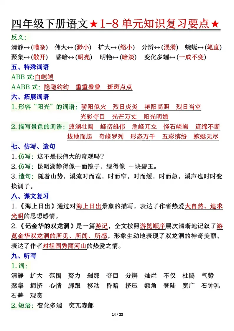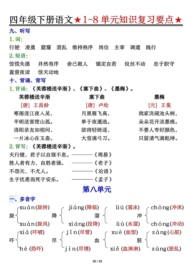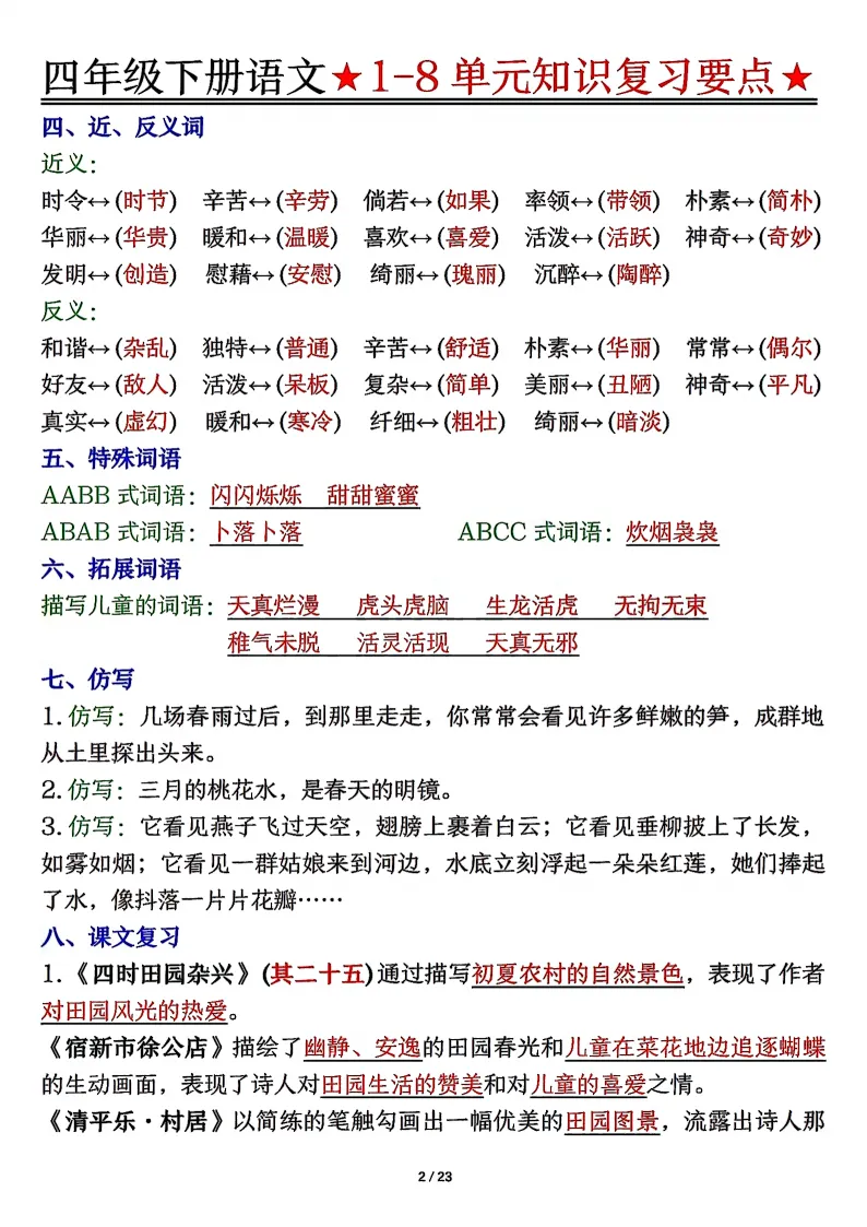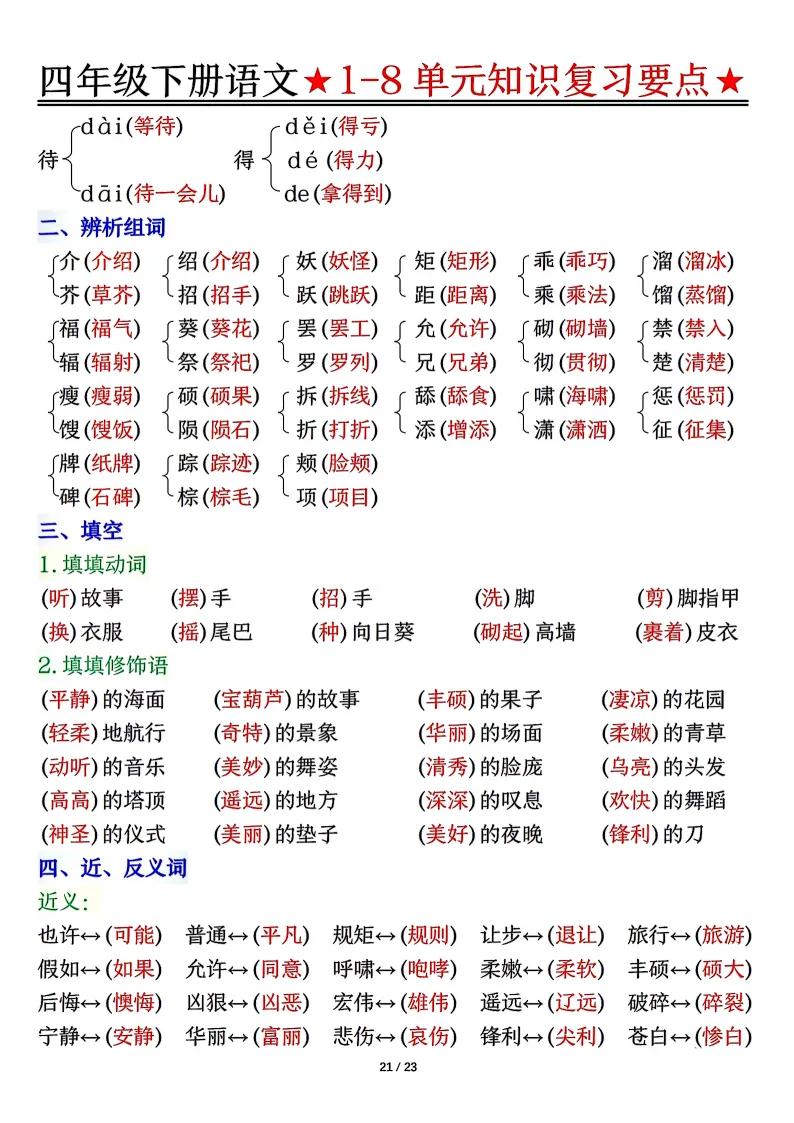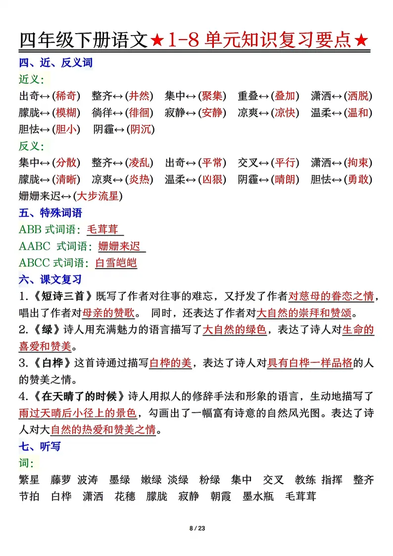 四年级(下)语文1-8单元知识复习要点(23页),电子版可打印