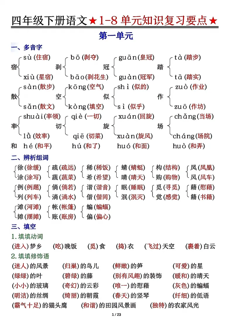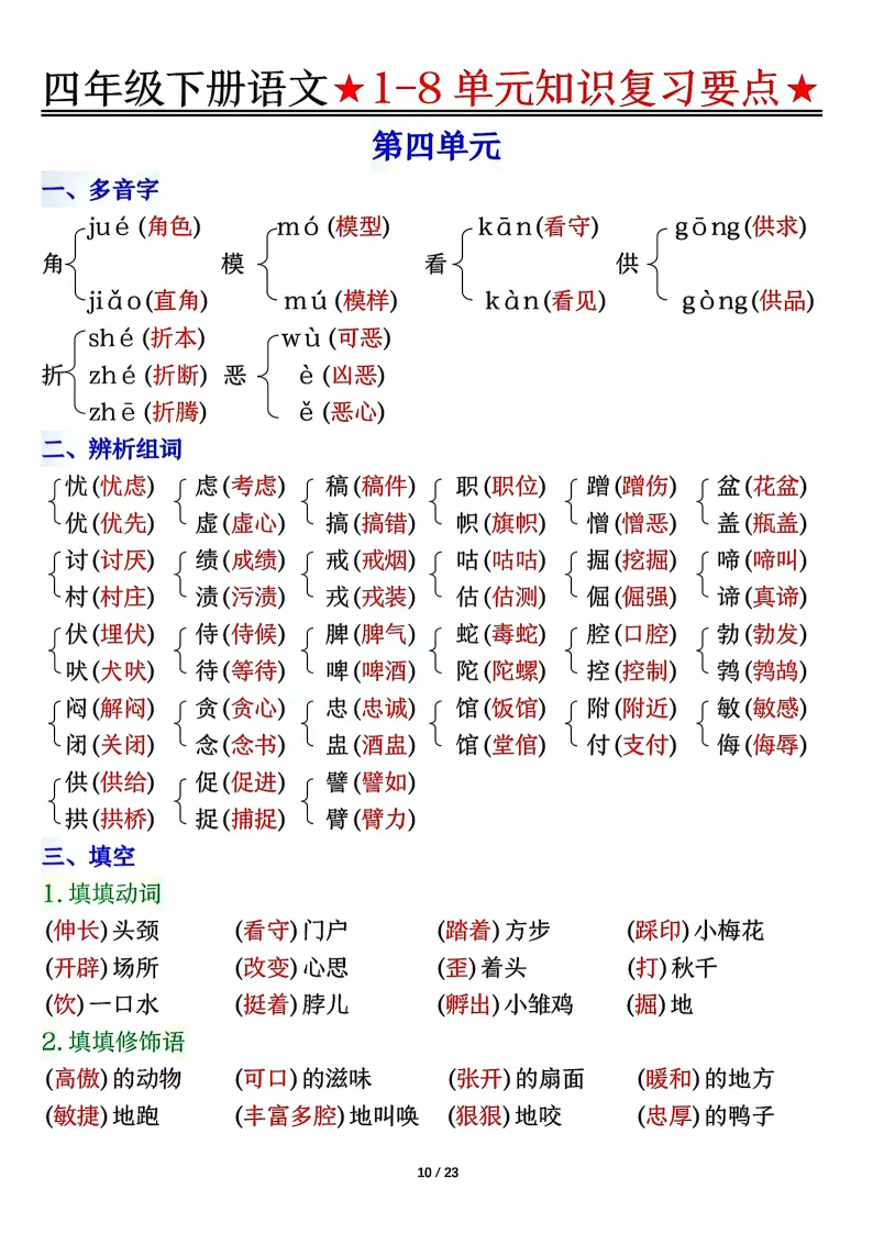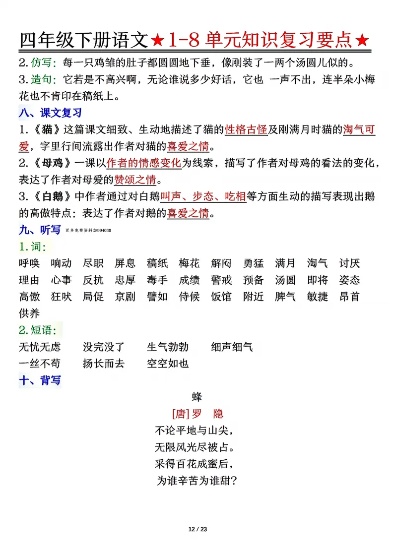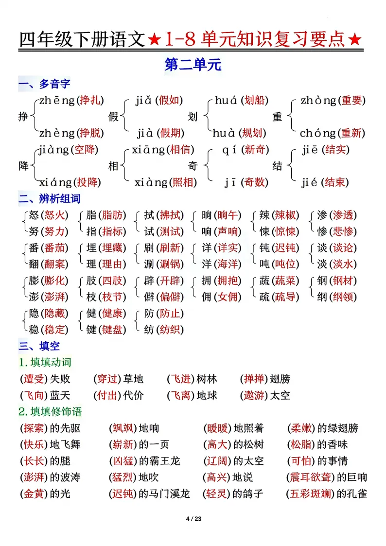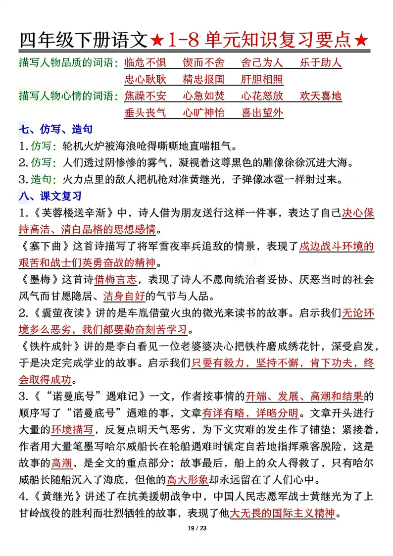 四年级(下)语文1-8单元知识复习要点(23页),电子版可打印