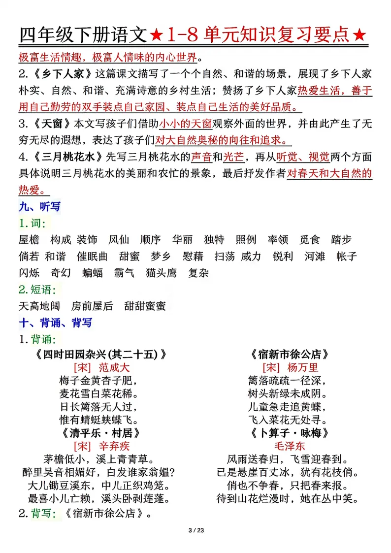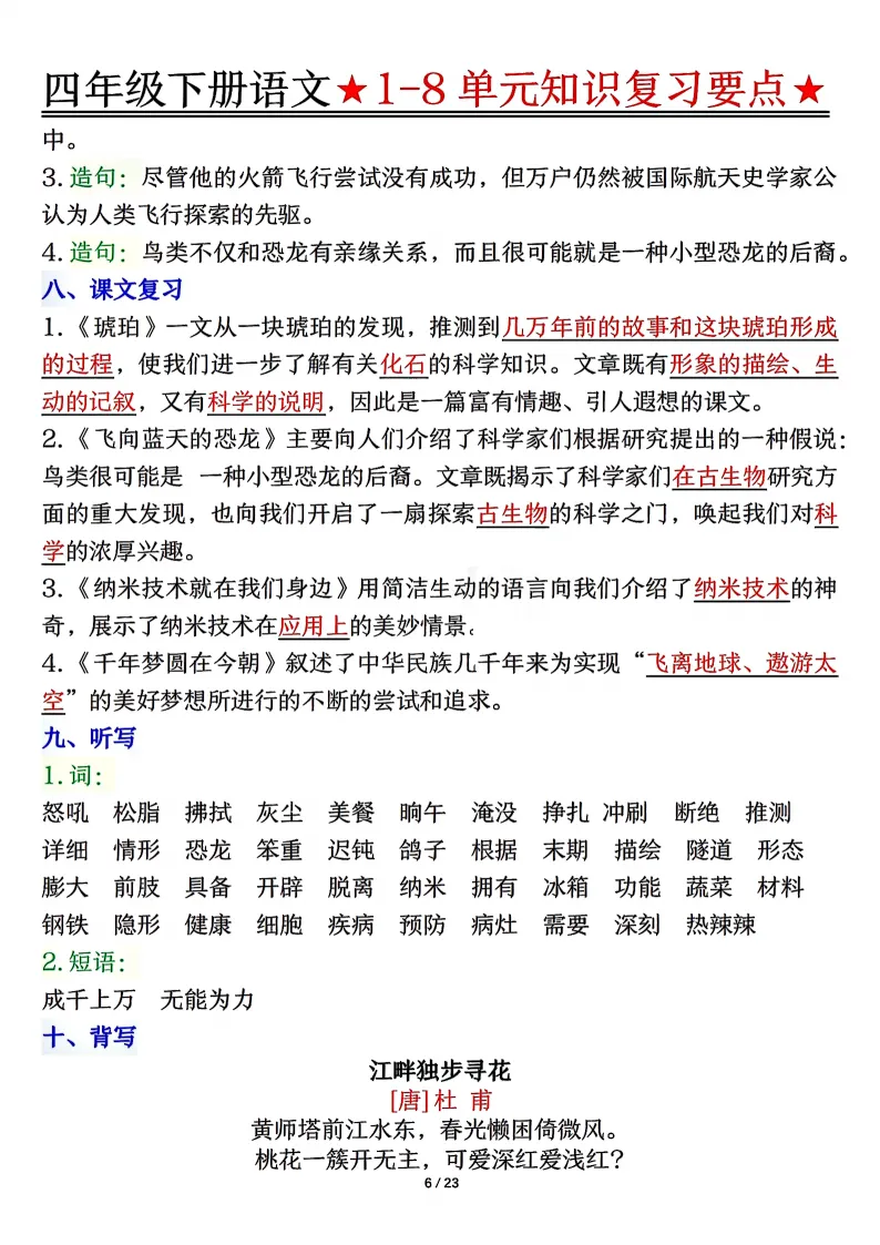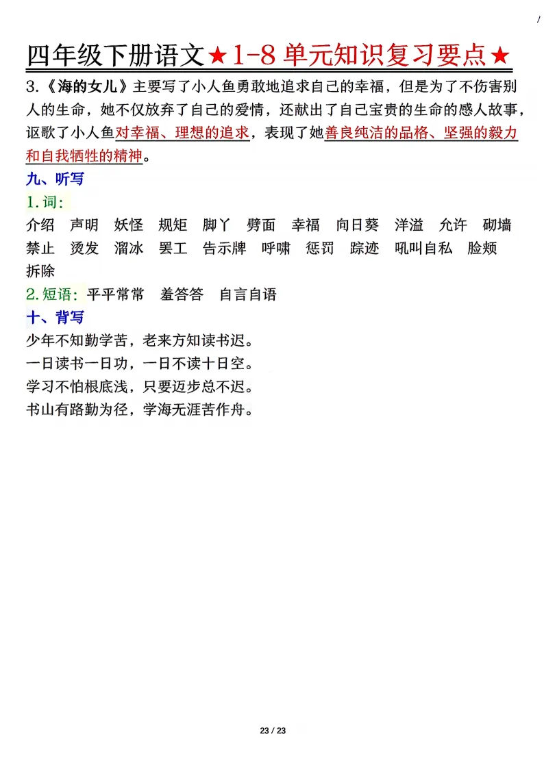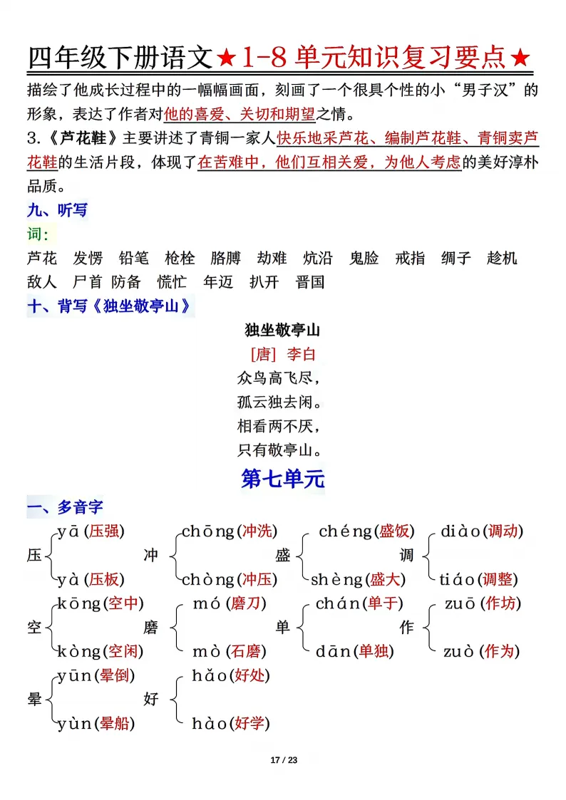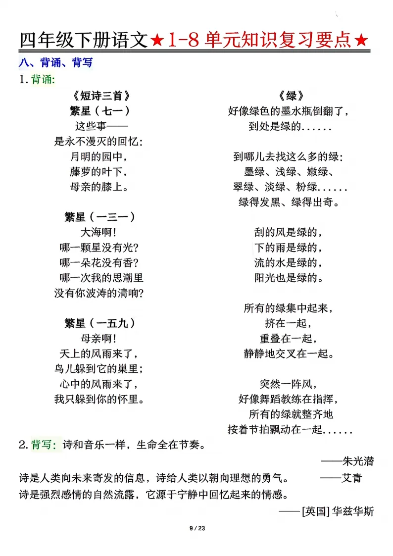 四年级(下)语文1-8单元知识复习要点(23页),电子版可打印