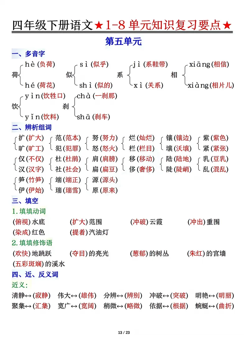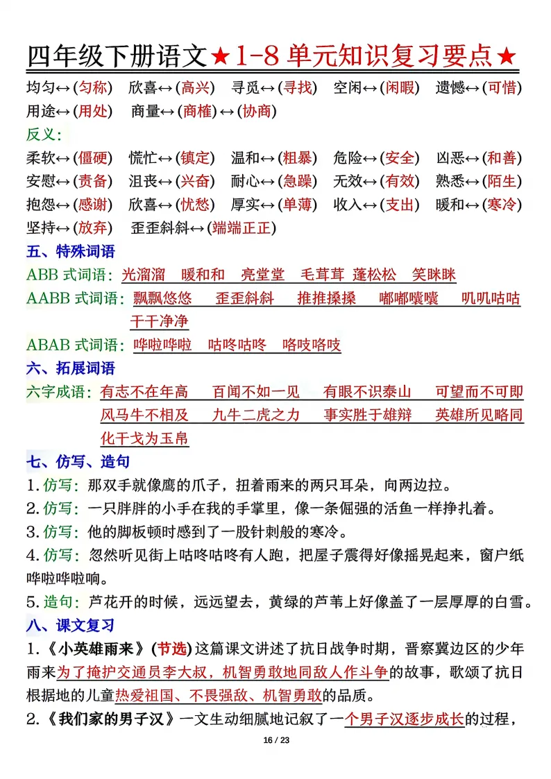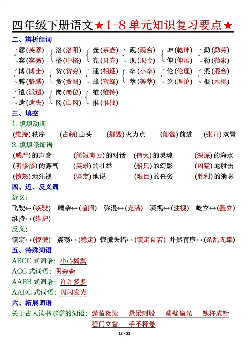 四年级(下)语文1-8单元知识复习要点(23页),电子版可下载,同步教材每课内容。需要的家长抓紧打印出来,让孩子用起来。