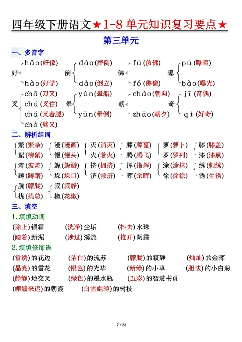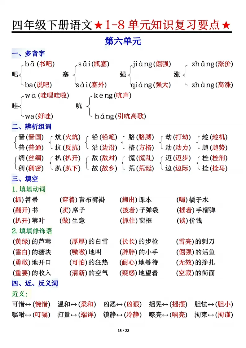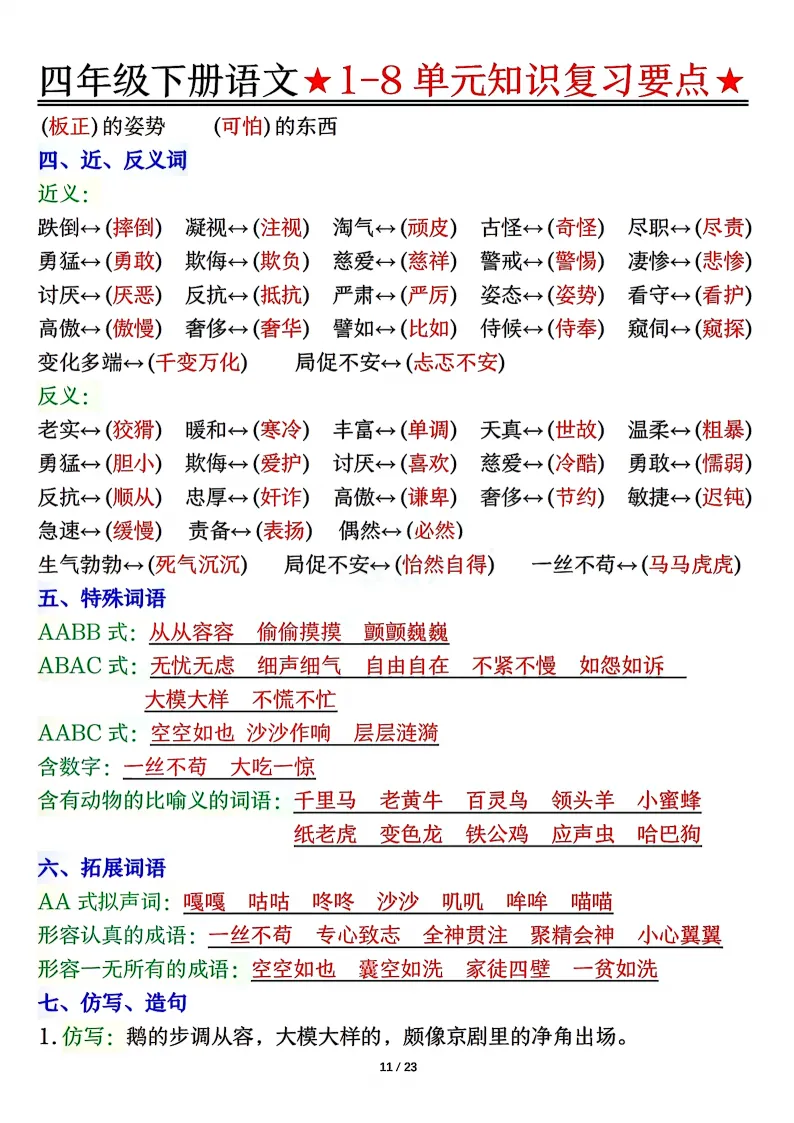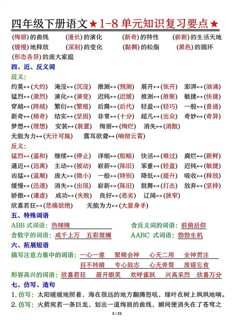 四年级(下)语文1-8单元知识复习要点(23页),电子版可下载,同步教材每课内容。需要的家长抓紧打印出来,让孩子用起来。