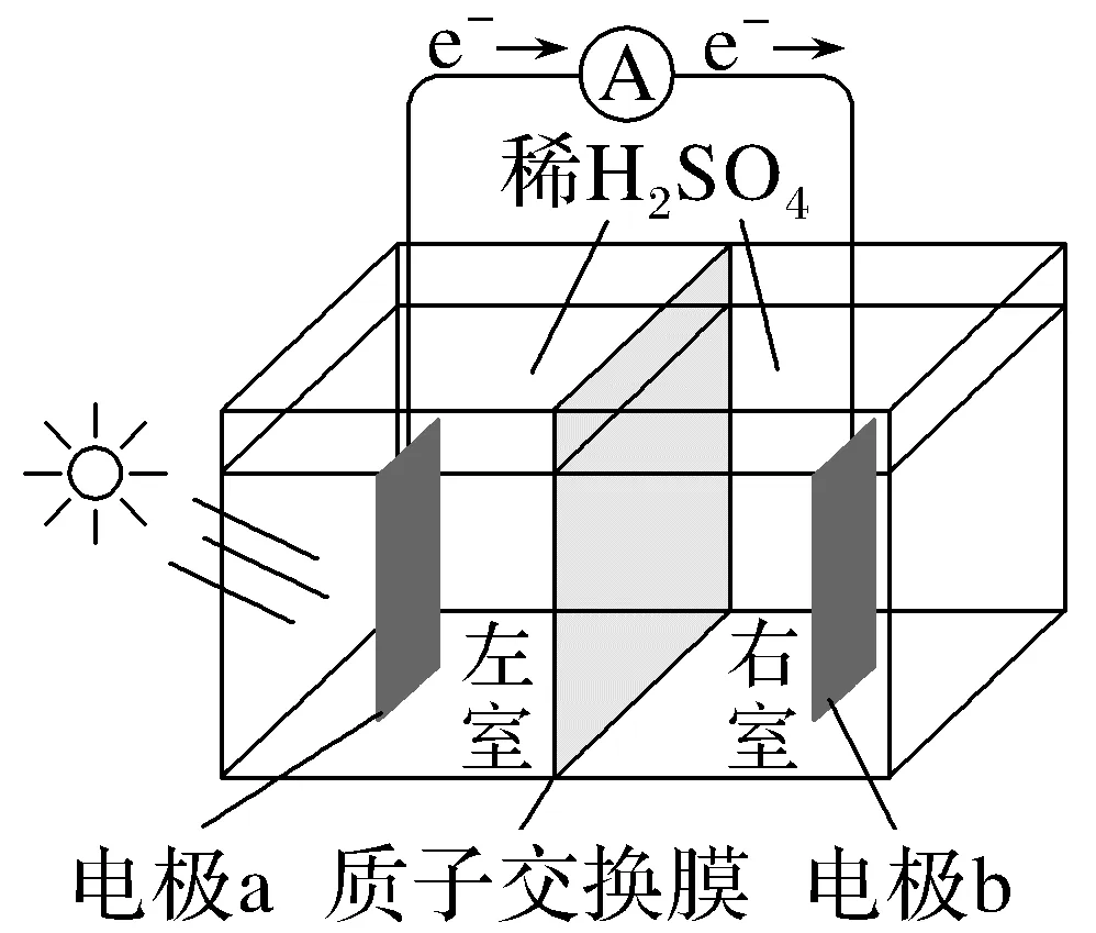 解析由图可知,该原电池中电子由电极a向电极b移动, 故电极a失电子作负极,电极反应式为2H2O-4e-===4H++O2↑;电极b得电子作正极,电极反应式为2H++2e-===H2↑;H+由负极向正极移动。由上述分析可知,电极a上发生氧化反应生成O2,A正确;H+由负极向正极移动,即通过质子交换膜由左室向右室移动,B错误;由总反应可知,光解时消耗水,电解质溶液中硫酸浓度逐渐增大,故溶液pH减小, C错误;由正极反应式可知,电路中每通过0.01mole-,电极b上产生 0.005molH2,D错误。