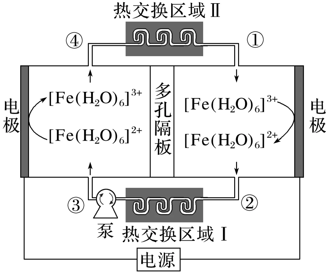 在电极上发生相互转化,伴随着热量的吸收或释放,经由泵推动电解质溶液的循环流动(①→②→③→④→①)实现制冷。装置只通过热交换区域Ⅰ和Ⅱ与环境进行传热,其他区域绝热。下列描述错误的是( )