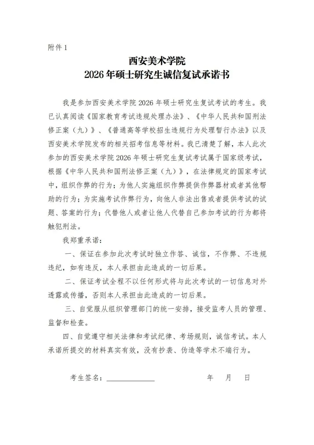 严把复试入口关,严格审查核验考生的资格,应届生交验《教育部学籍在线验证报告》、往届生交验《教育部学历证书电子注册备案表》,每位参加现场复试的考生须签署《西安美术学院2026年硕士研究生诚信复试承诺书》(见附件1)。