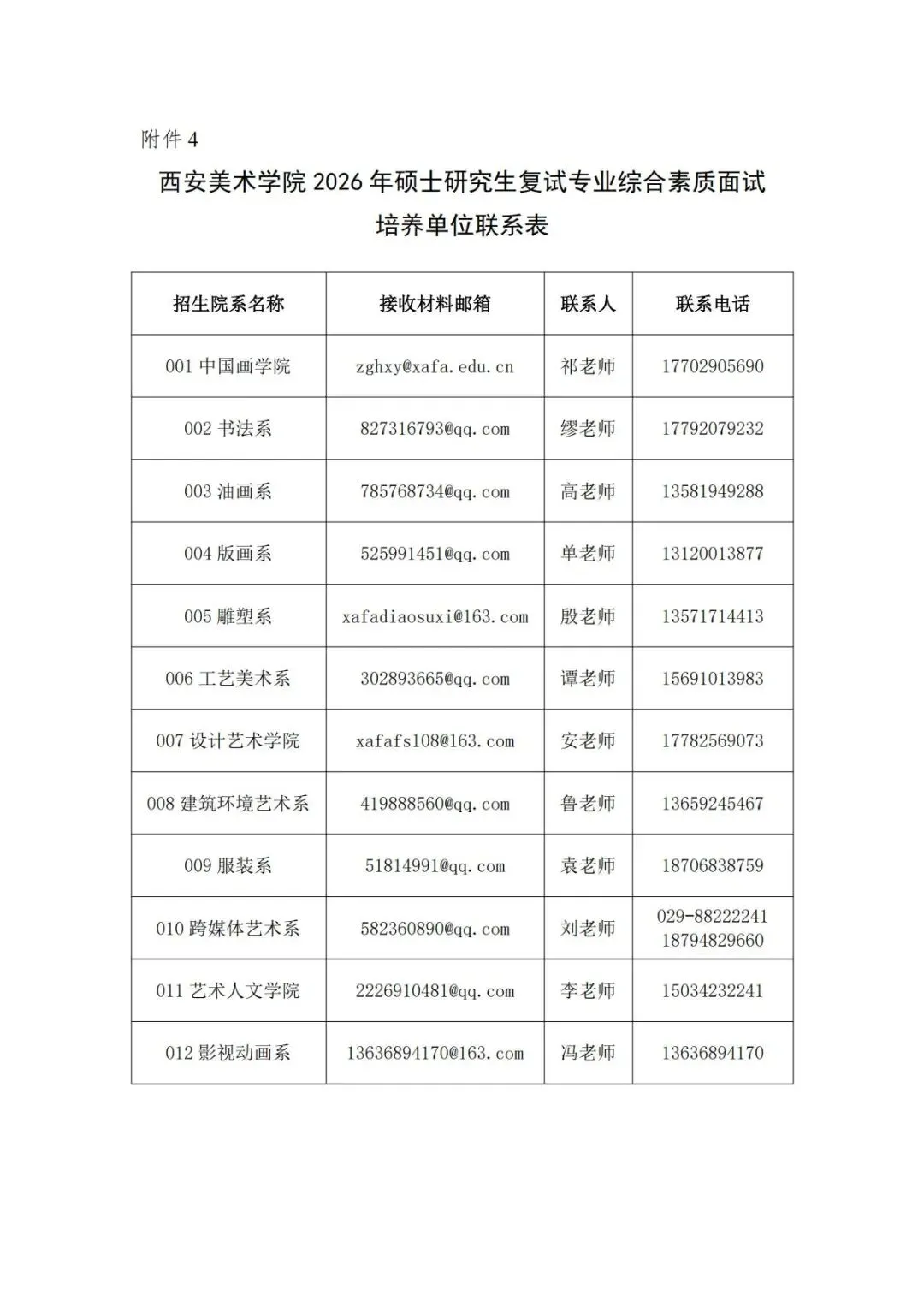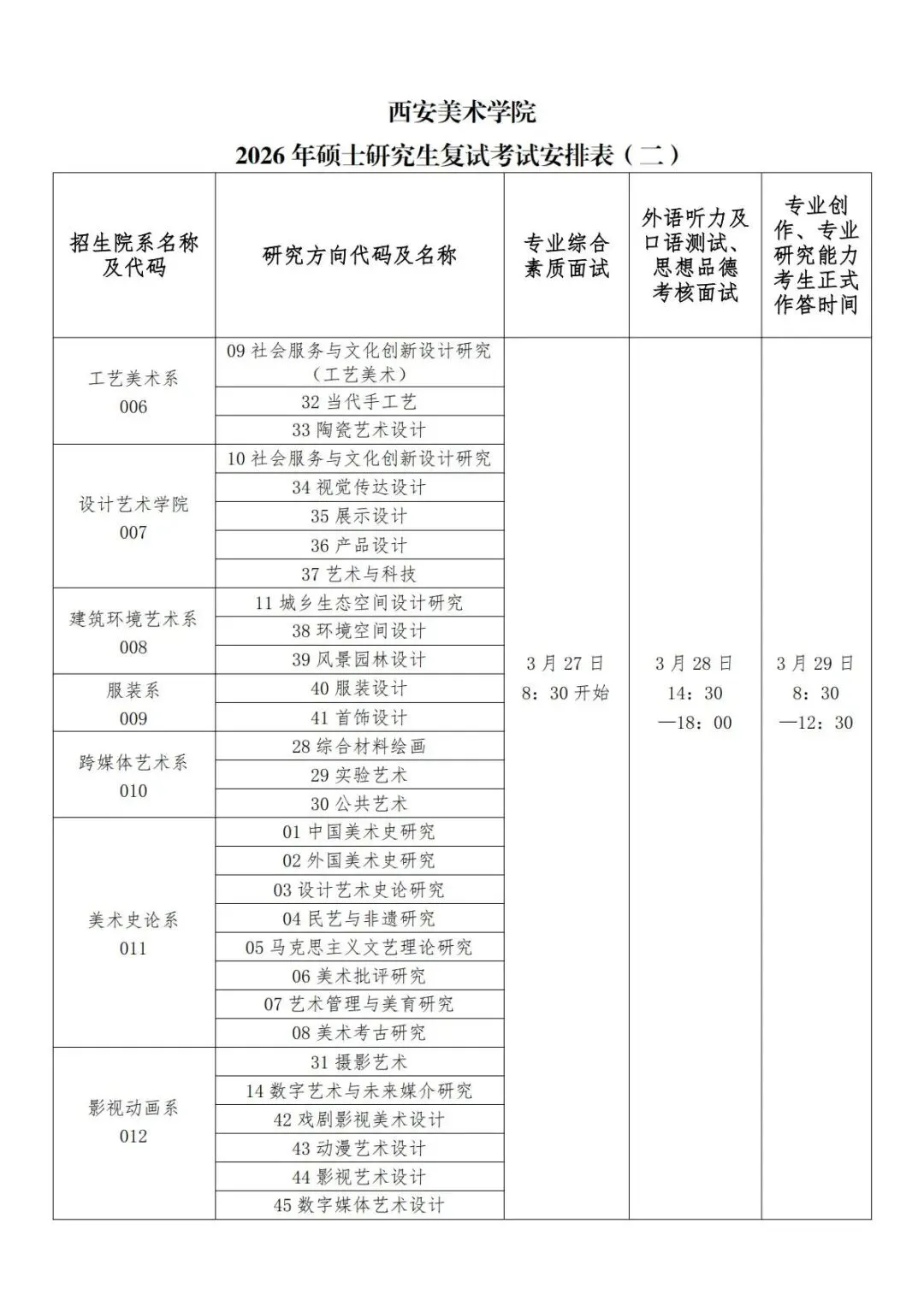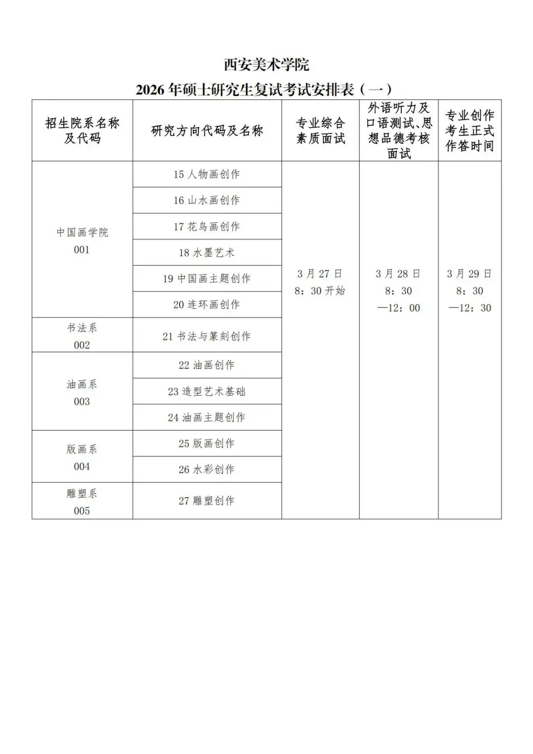 (4)地点:招生处统一安排,按院系分上、下午进行,详见《西安美术学院2026年硕士研究生复试考试安排表》(附件3)