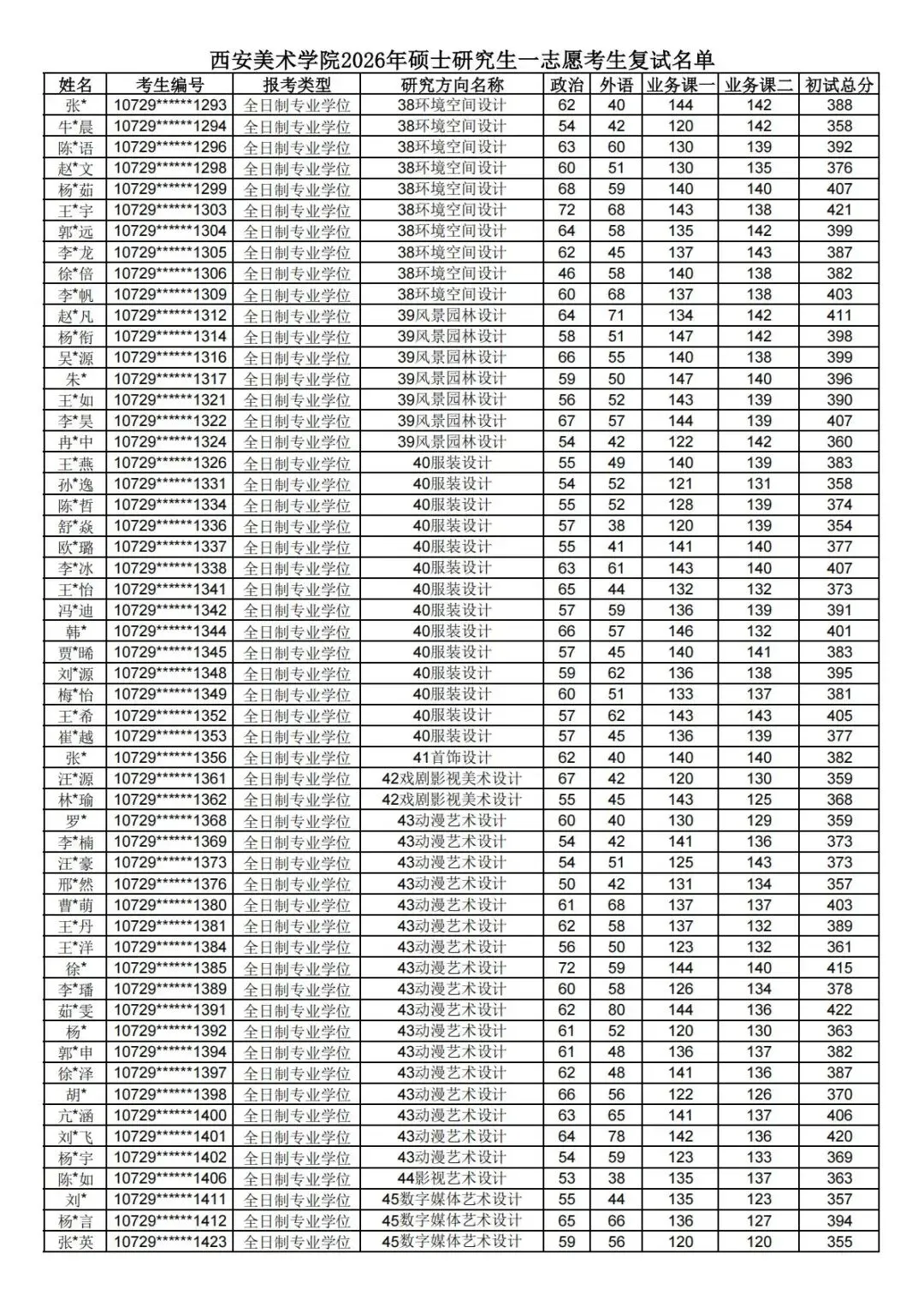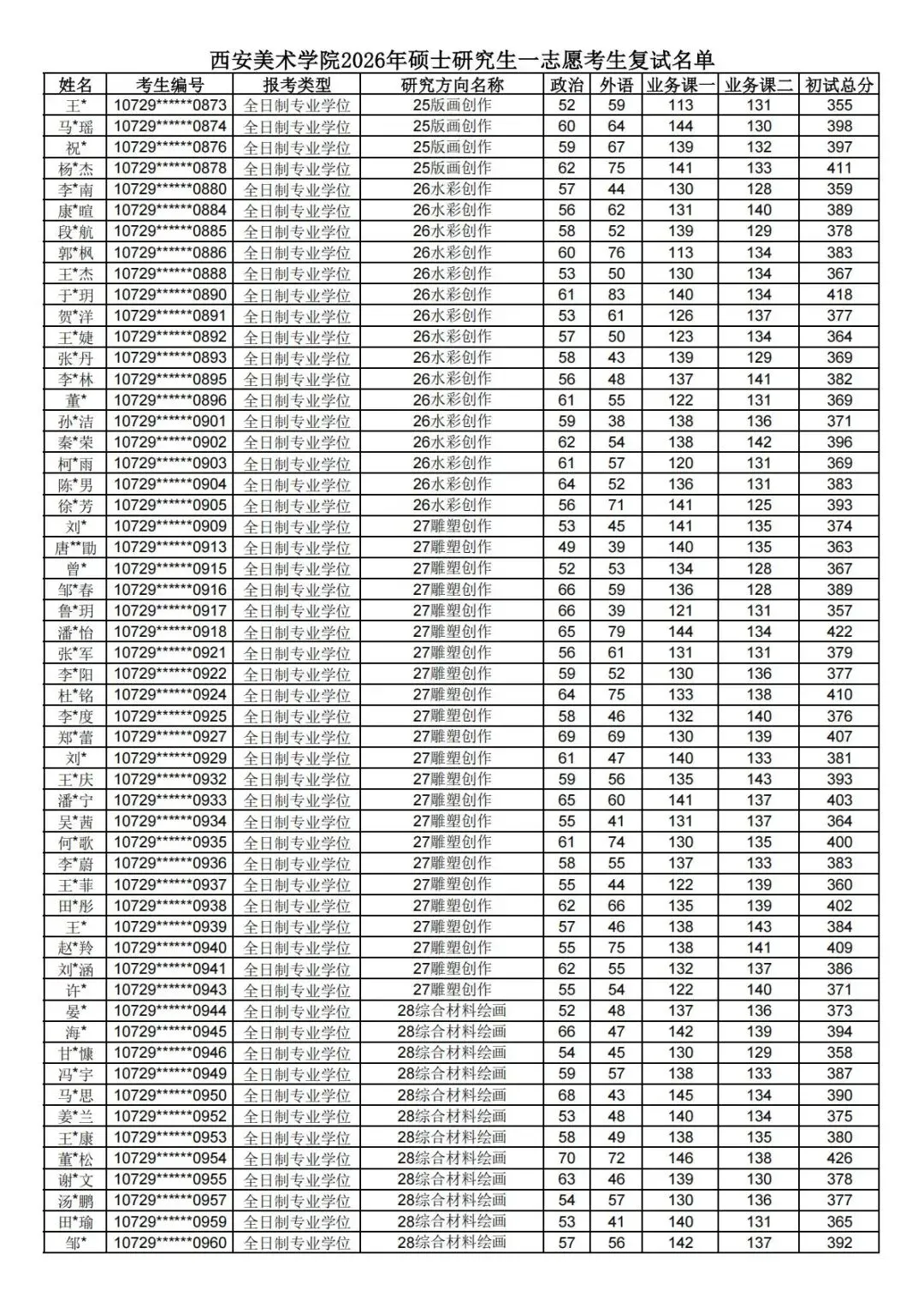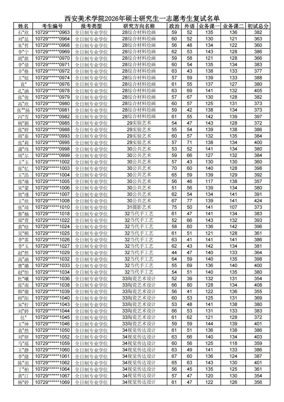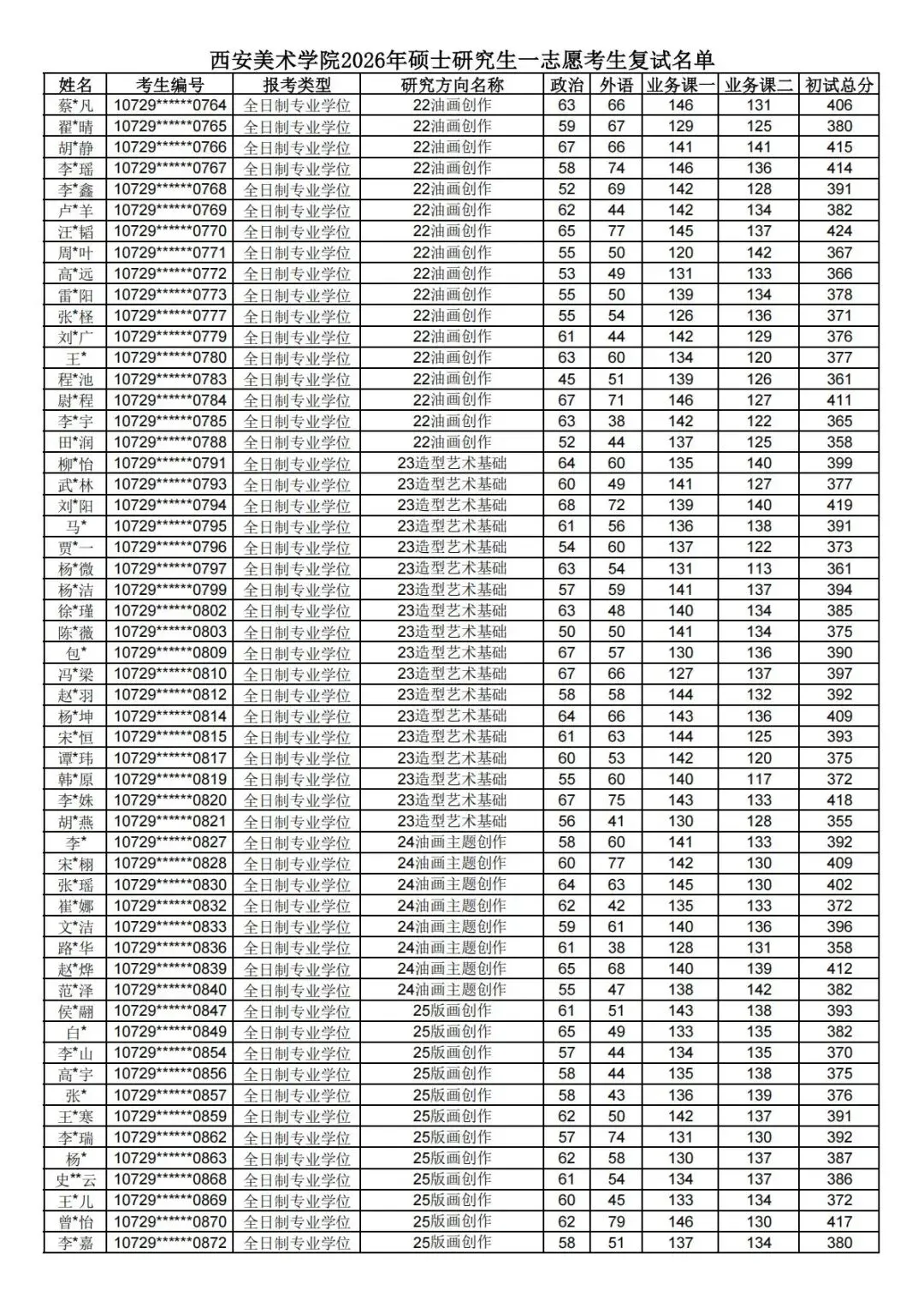 1.对符合拟录取条件的考生,依据《西安美术学院2026年硕士研究生招生计划拟分表》(后期根据工作进展适时发布),分研究方向按总成绩由高到低择优录取,如出现同分,按复试成绩、业务课二成绩、业务课一成绩依次排序。未完成的计划由学校统一调整。