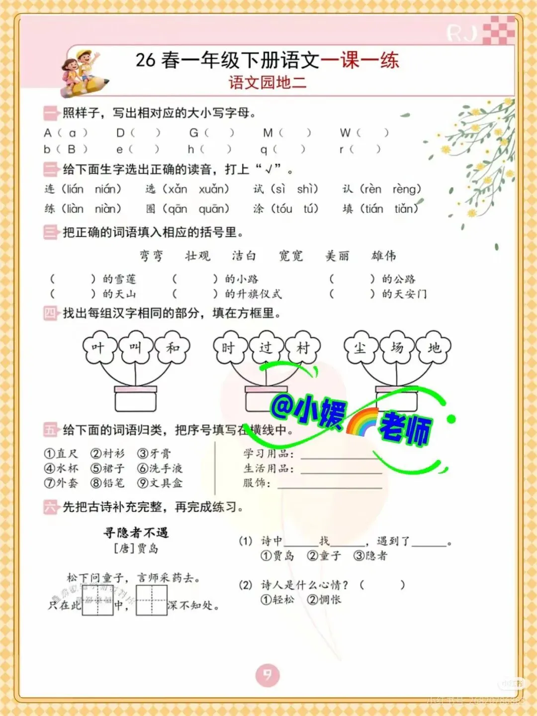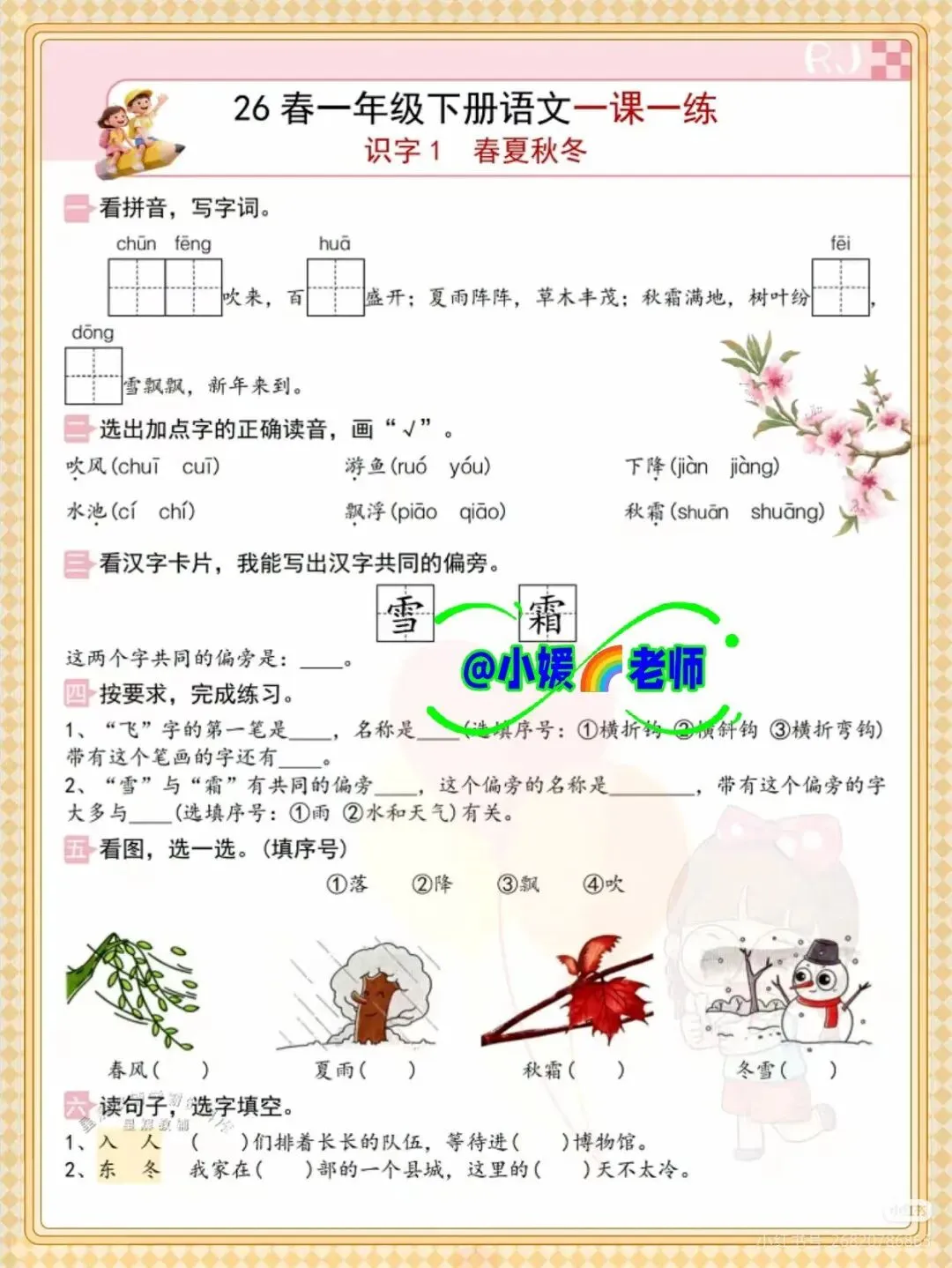 今天分享一份我自己在用的好资源——《RJ版一年级下册语文一课一练》电子版。说真的,整理得特别全,每一课都分好几个板块:看拼音写词语打基础,近反义词、句子仿写、古诗和阅读理解都覆盖了。关键还带了详细的答案解析,孩子做完自己就能对照检查,家长辅导起来也省心多了。