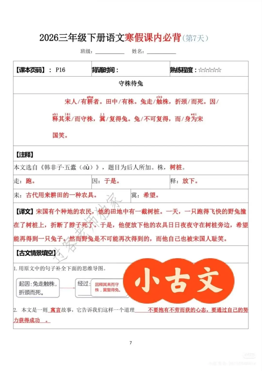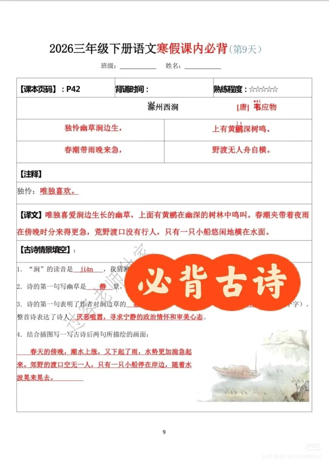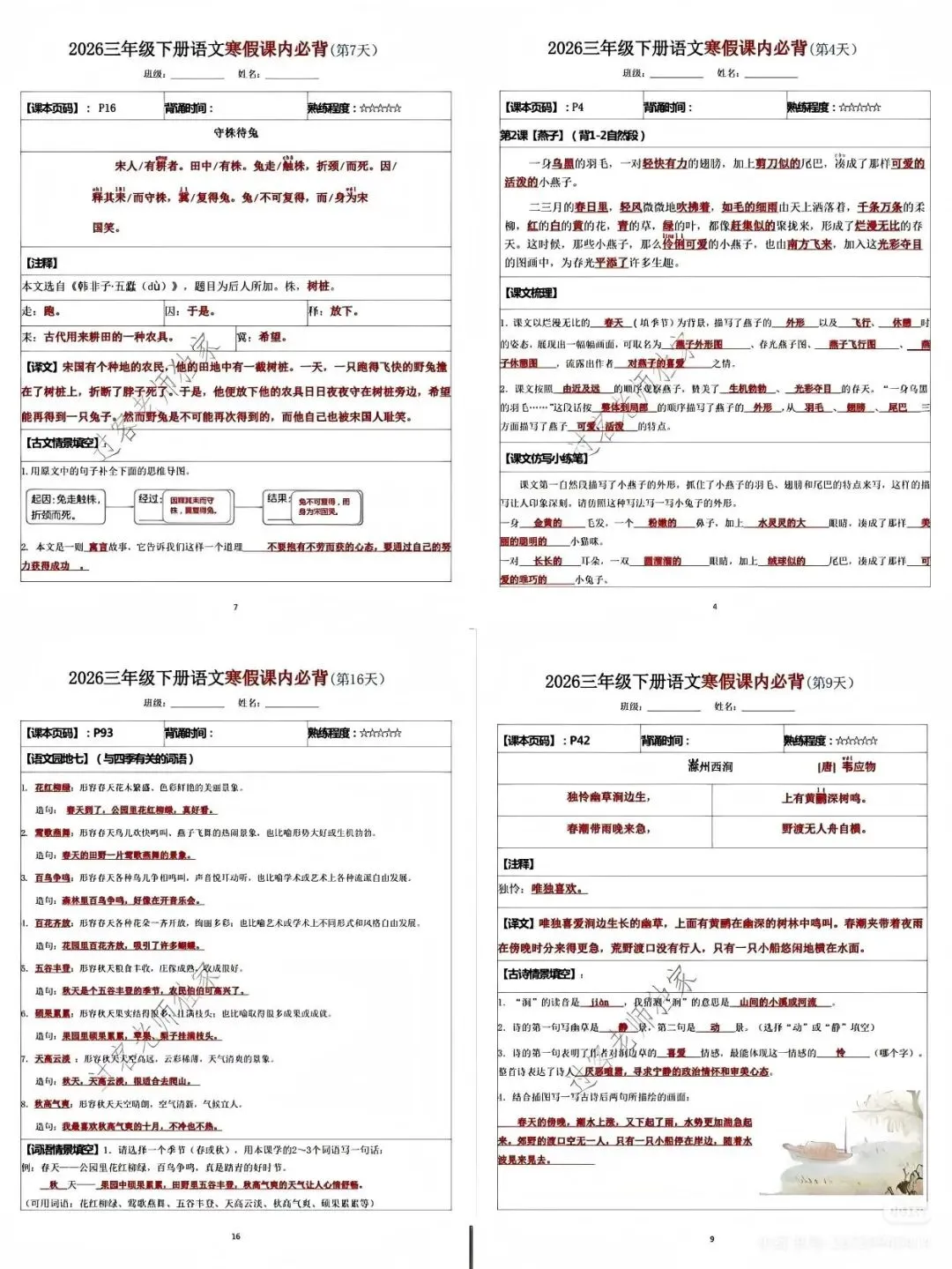 这份资料是三年级下册语文课内必背内容的整理,电子版PDF格式,自己打印出来用就行。里面包含了寒假复习最核心的几块: