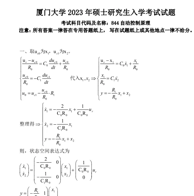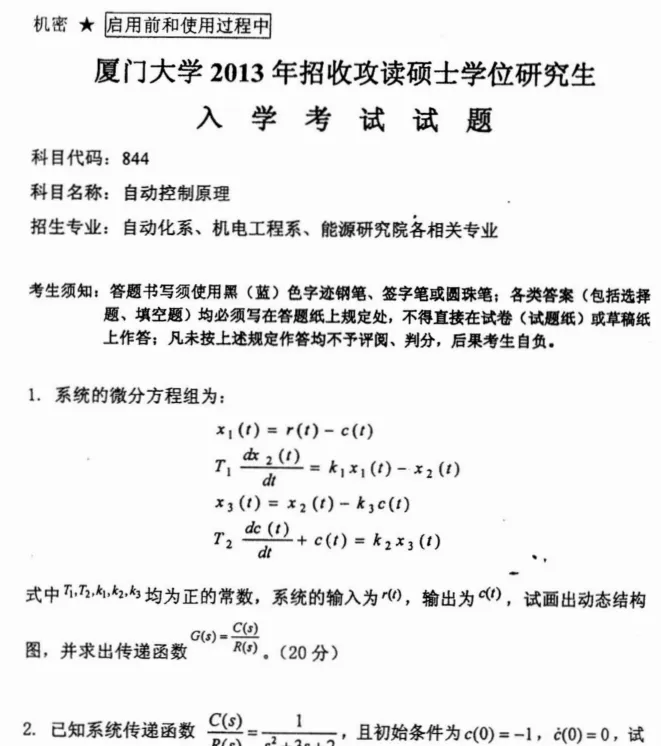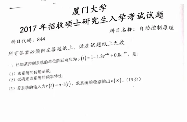 2000-2025年厦门大学844自动控制原理考研真题试卷