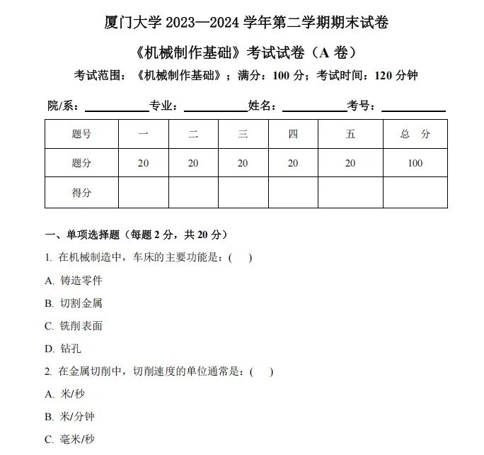2024年厦门大学824机械制造基础考研真题试卷与答案