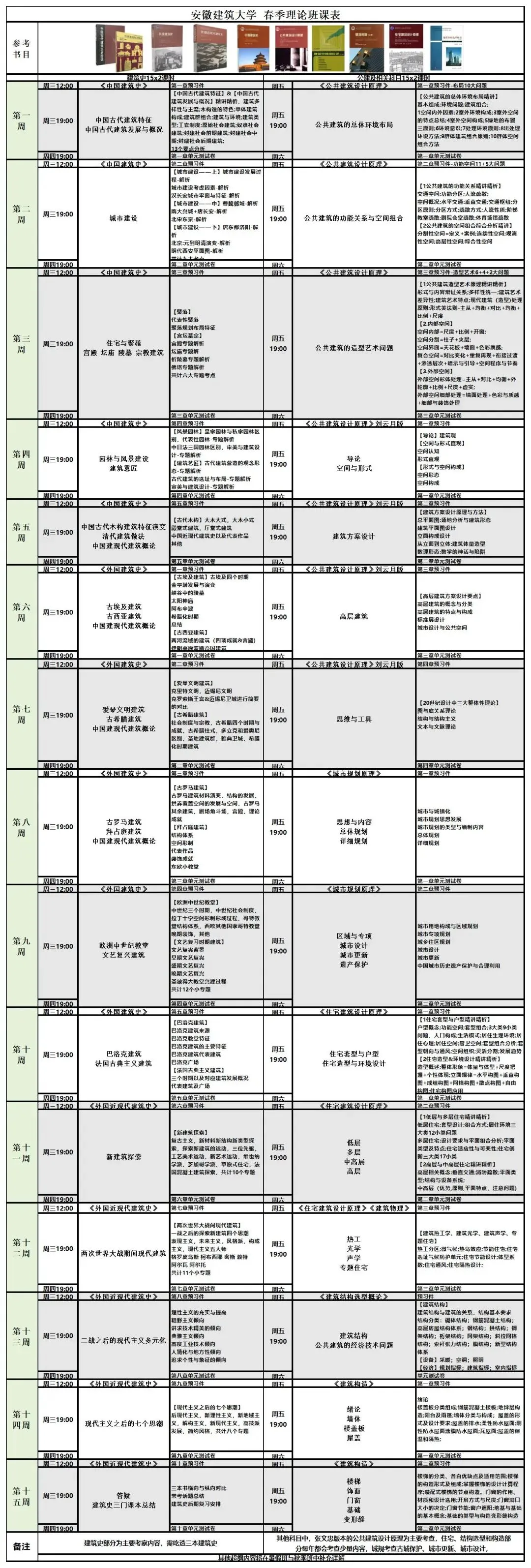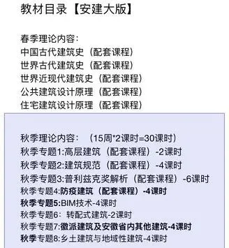 住宅建筑史(4课时),城市规划原理(4课时),民用建筑设计通则(4课时),徽派建筑专题(4课时),其他课外专题(4课时