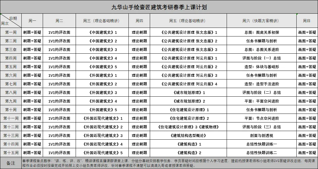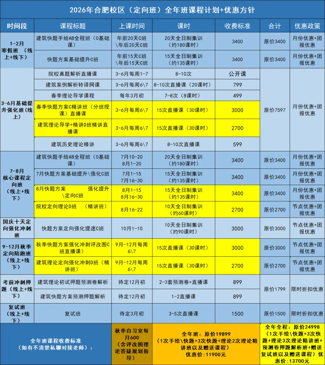 2026快题方案全年班课程安排时间段: 春季4月-7月快题方案网课直播课15次精讲+暑假快题方案强化提升班7月15天集训+8月快题方案面授定向强化班15天集训+国庆班集训10天定向冲刺班\9月-12月份秋季快题方案定向冲刺班,直播课15次直播课评改天图+快题方案预测押题解析班;