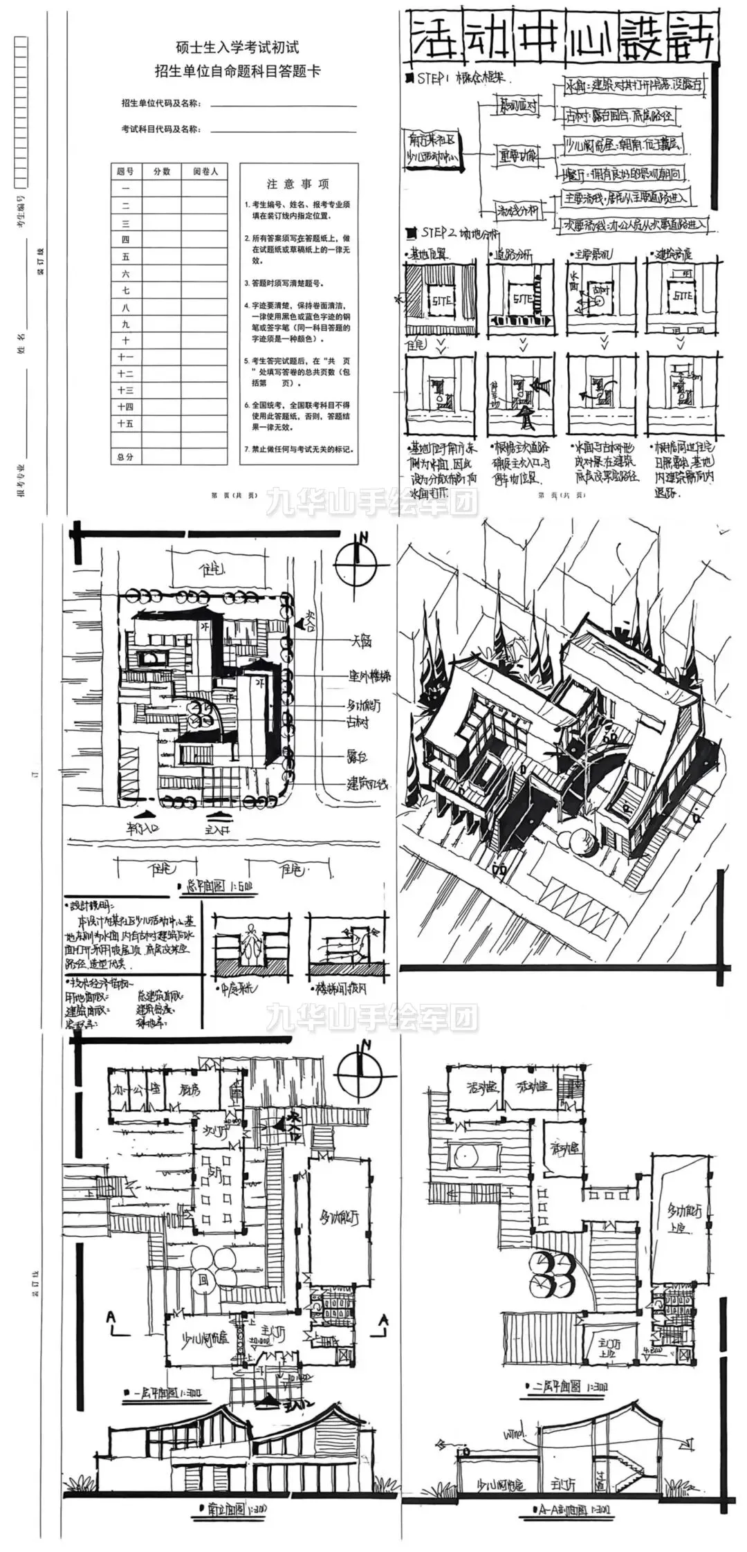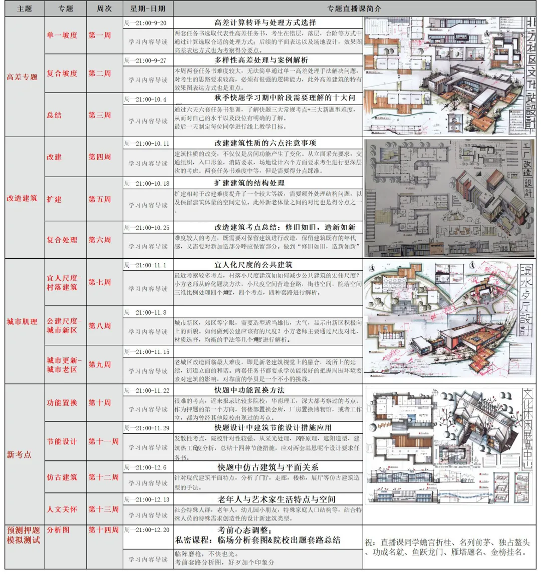 第4—10天(.10.04—10.10):依次对文化展览、民宿住宅、校园、体育、旅游度假、改扩建、绿色建筑等快题类型(大概率考察)进行练习和讲解。一天一张,白天画图,晚上集中讲解!注:期间针对快题考察方向分析、手绘技法表现及实际工程项目开展专题讲座。