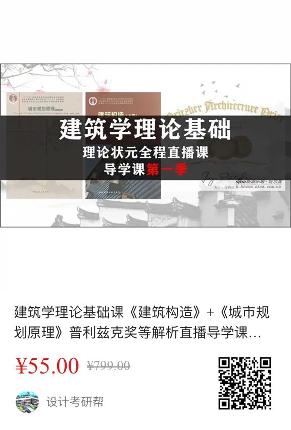 合工大(建筑与规划):公共建筑原理(10课时),住宅建筑原理(4课时),中外建筑史(4课时),绿色建筑、建筑热点话题普利兹克奖得主系列(6课时),国内著名建筑师专题(4课时),城市规划原理(14课时),建筑构造上(2课时),徽派建筑等专题(6课时),历年真题解析(6课时)