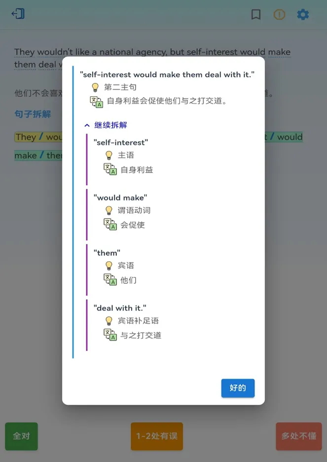 知能行的 AI 像私教一样,帮你一步步拆解句子成分。