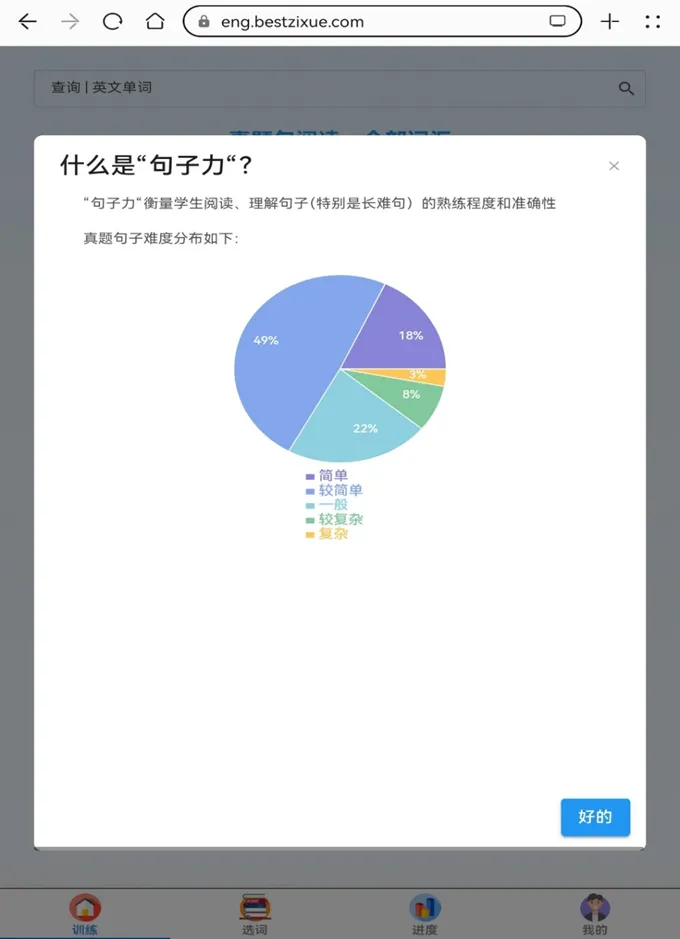 它不让你孤立地背单词,而是直接把你扔到句子里。 你在读句子的过程中,如果遇到不懂的词,点一下就能看释义,但更重要的是——它让你在句子里直接理解这个词。