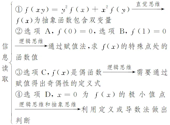 命题分析 本题以抽象函数为载体,考查函数的奇偶性与极值,属于课程关联情境.通过对复杂关系式赋值的过程考查学生的逻辑思维和直觉思维,通过奇偶性的判定考查学生运用演绎、归纳和类比进行推理的能力,通过同构法构造函数的过程考查学生的转化与化归思想和数学建模能力.