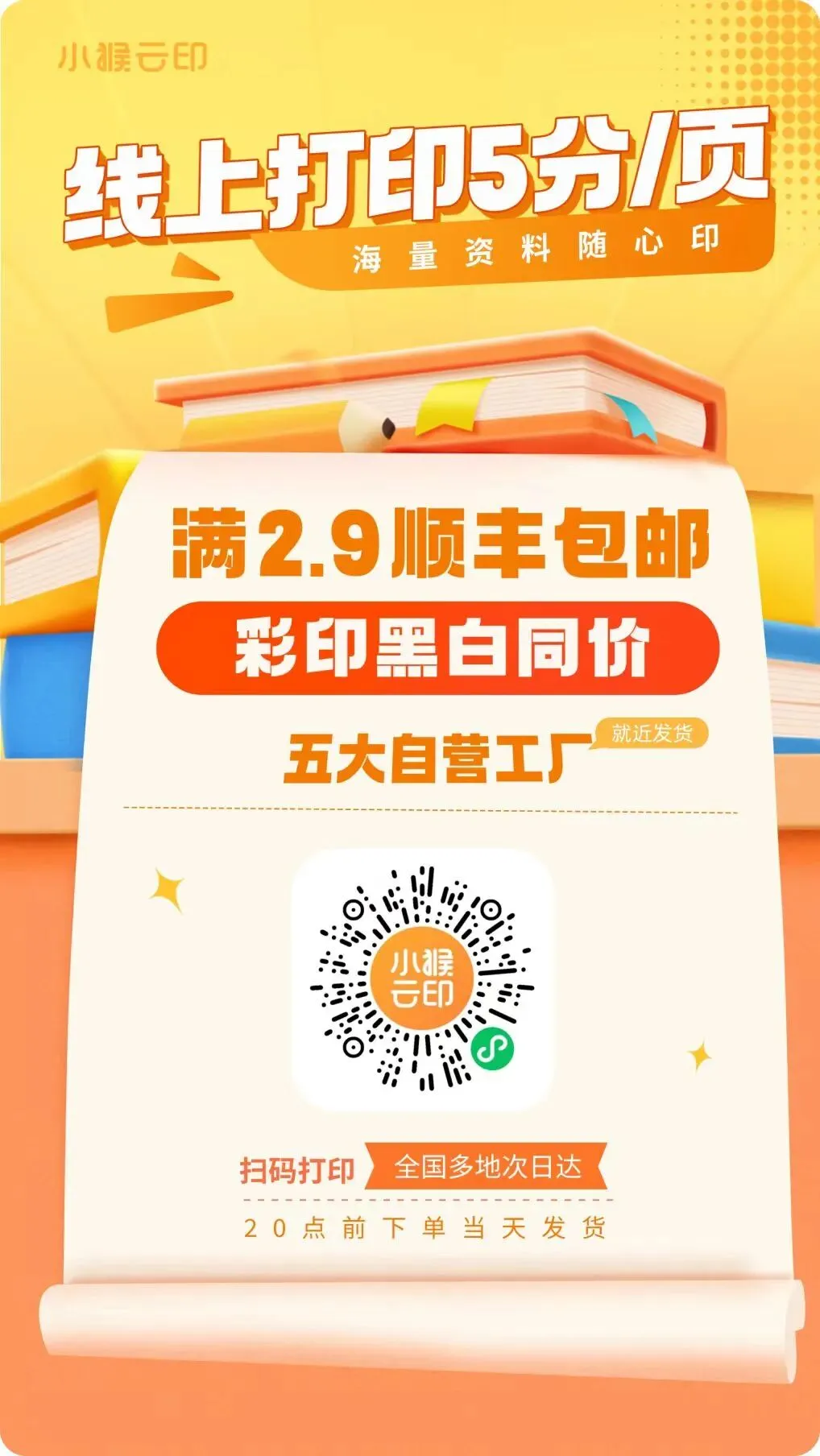 小猴云印的服务主要包括学生作业、复习试卷、书籍教材等常见的文档打印,覆盖了多种打印类型,可以满足大家的不同需求。快来体验吧~