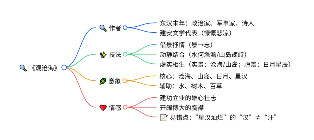 赏析:本诗是曹操的经典诗作。诗人登临碣石,以宏大的视角描绘沧海景象。海水荡漾,山岛竦立,树木繁茂,秋风起时洪波涌起,尽显大海的雄浑壮阔。尤其“日月之行,若出其中;星汉灿烂,若出其里”,以夸张想象,将日月星辰的运行与大海相融合,不仅展现出大海的浩瀚无垠,更借大海的包容,抒发了自己渴望统一天下、建功立业的雄心壮志,尽显豪迈气概与广阔胸襟,是借景抒情、展现宏大抱负的典范之作。