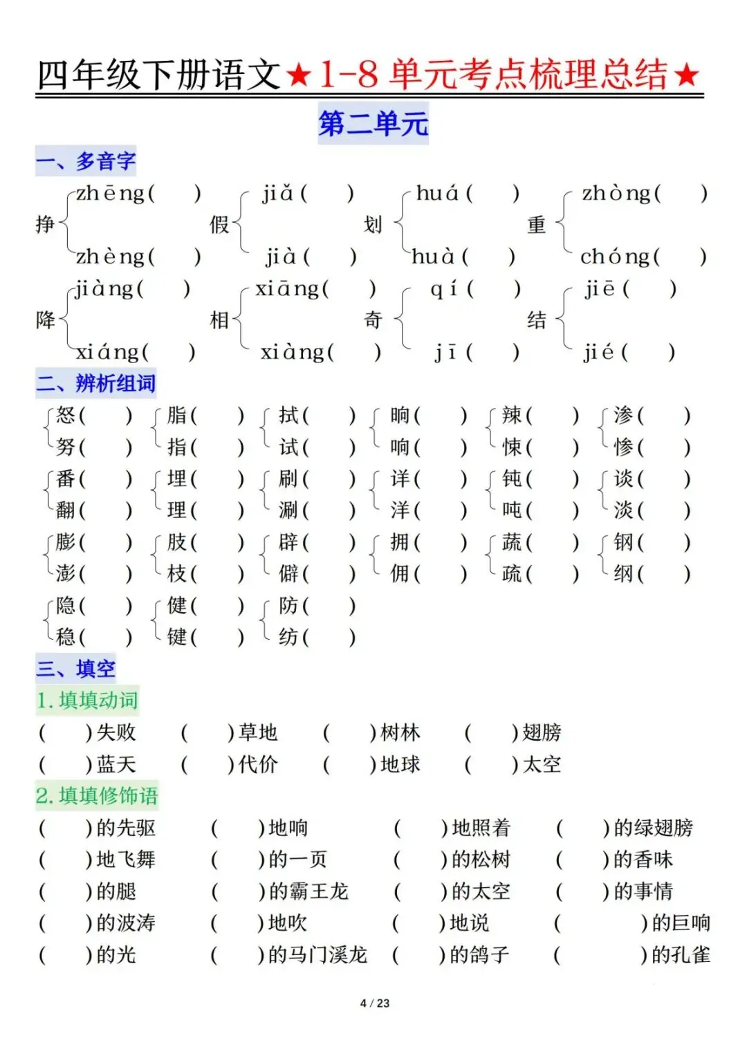 当前位置:首页>复习资料>四下语文1-8单元知识复习要点(空白+答案46页)