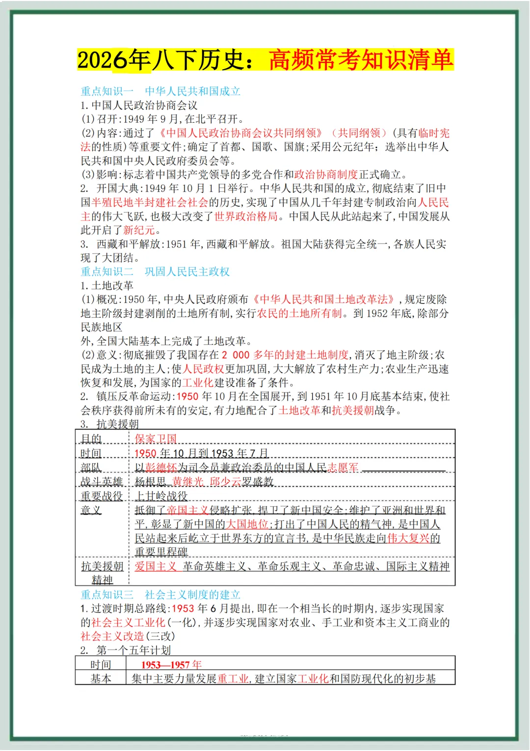>2026 新版本八年级下册历史期中复习重点知识点必背总结,可打印完整版!