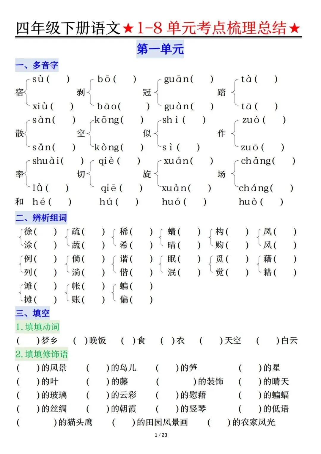 26春四下语文1-8单元知识复习要点(空白+答案46页)需要的家长抓紧打印出来,让孩子练一练吧。
