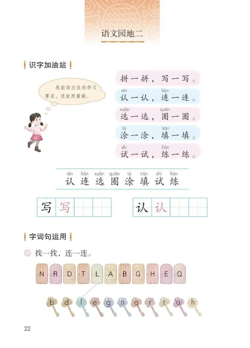 • 生字:认、连、选、圈、涂、填、试、练、写