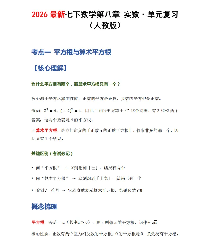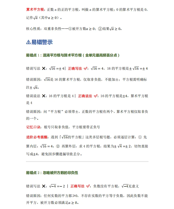 下面这份资料,把上面这几个坑——还有实数单元的其他考点和易错点——都拆开讲清楚。每个易错点都有错误×和正确√的对比,还配了例题思路分析和一套检测题。如果正在学这个单元,或者期末复习需要,可以存下来慢慢看。②:关注下方公众号,点击发消息,在公众号对话框中回复:实数声明:资料为本人整理,仅供学习交流使用,如对您有帮助,麻烦分享给身边的同学!