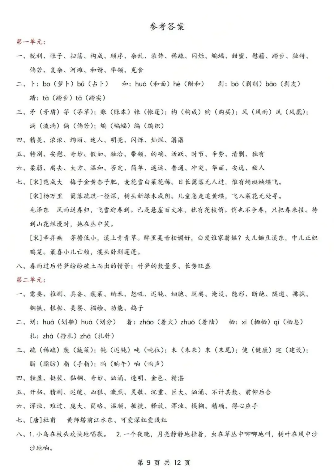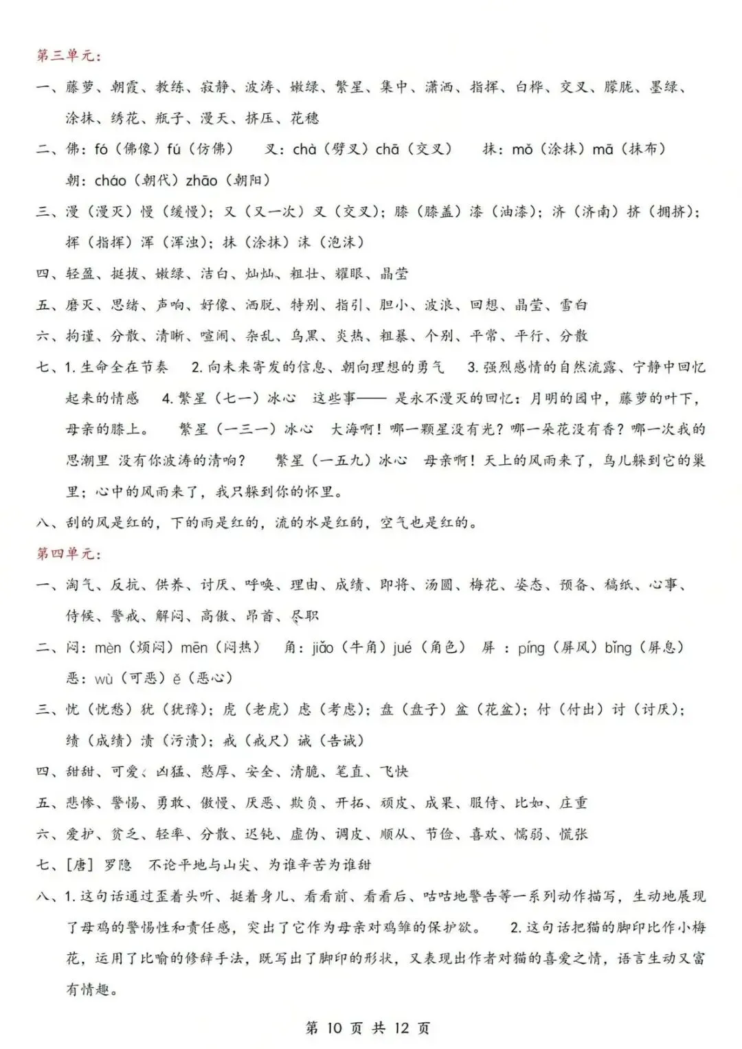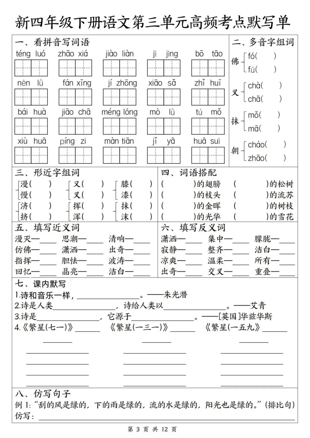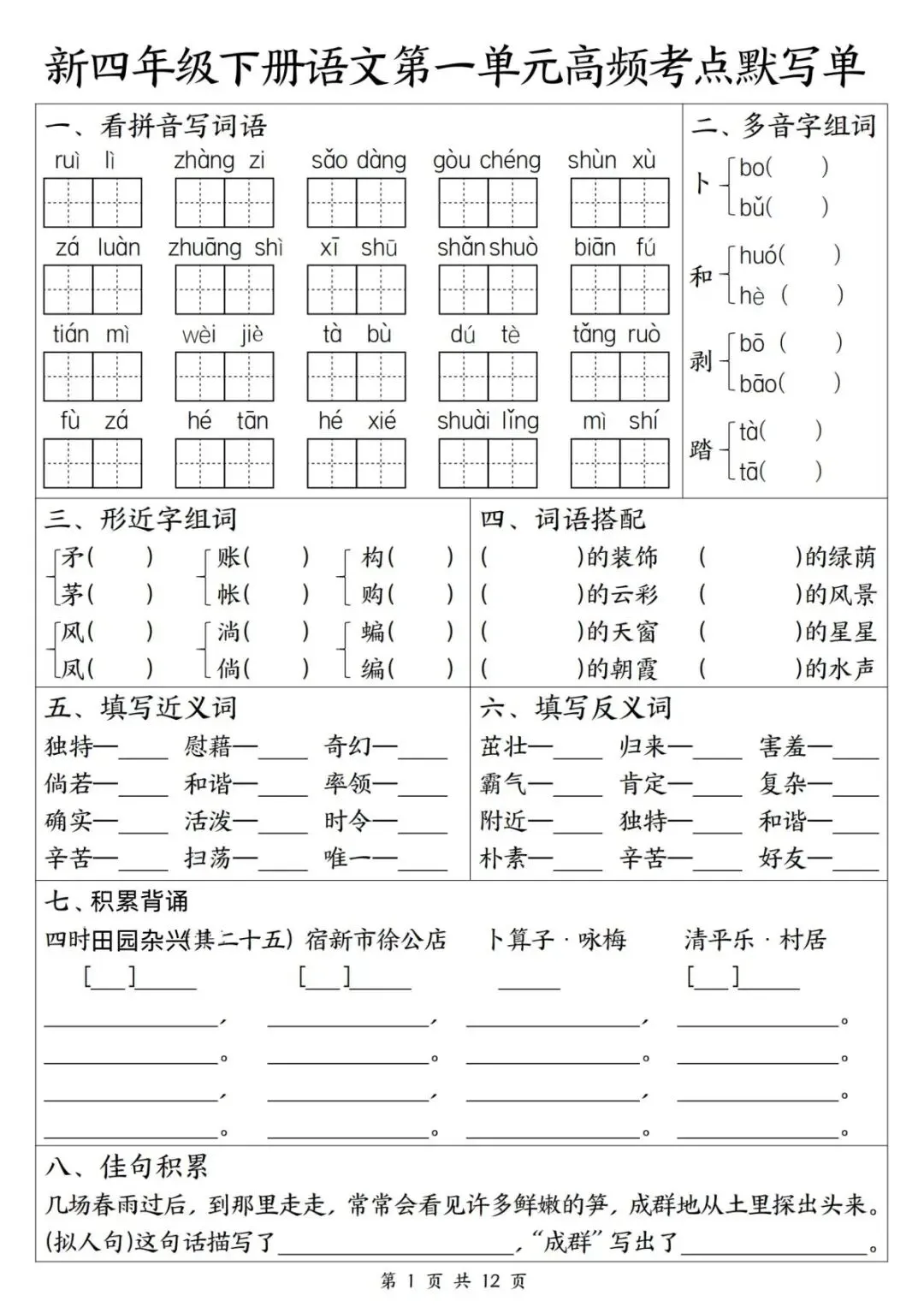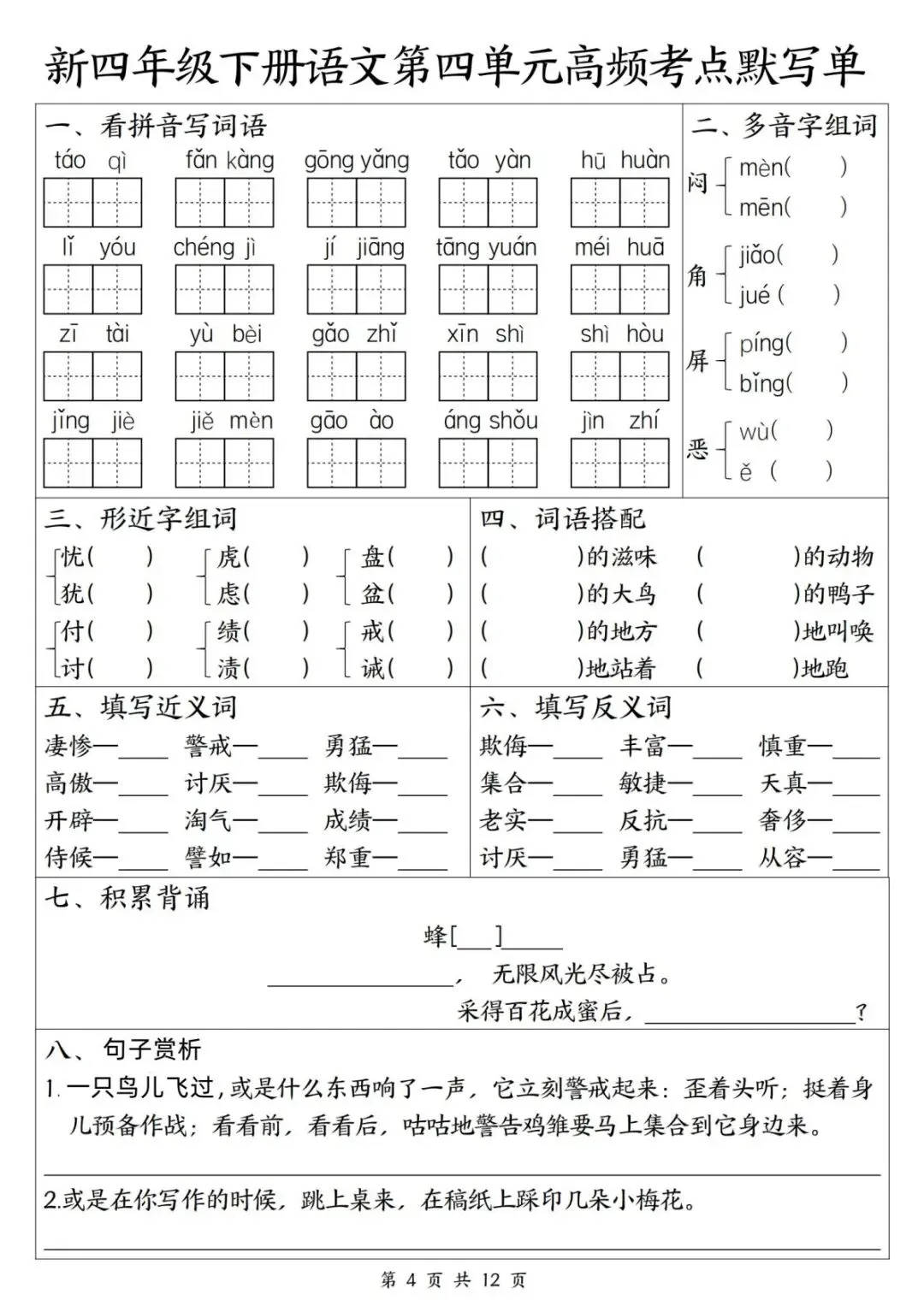 【小学资料】四年级下册语文期中复习《1-4单元高频考点默写单》(含答案)电子版可打印
