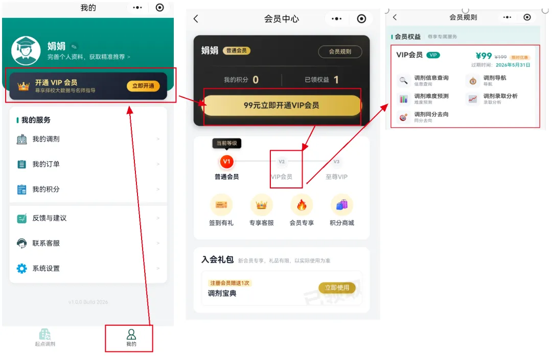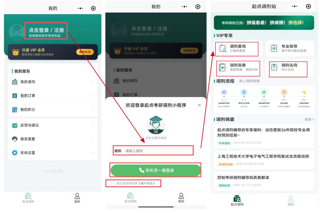 第二,点击小程序,进来后点击右下角”我的”,呈现如下界面,点击”登录/注册”一输入”昵称”一”手机号一键登录”一勾选“我已阅读并同意《用户协议》”;登录完成后,回到首页VIP专享区主要有三个模块,分别是"调剂查询”,"调剂宝典",“调剂去向”;
