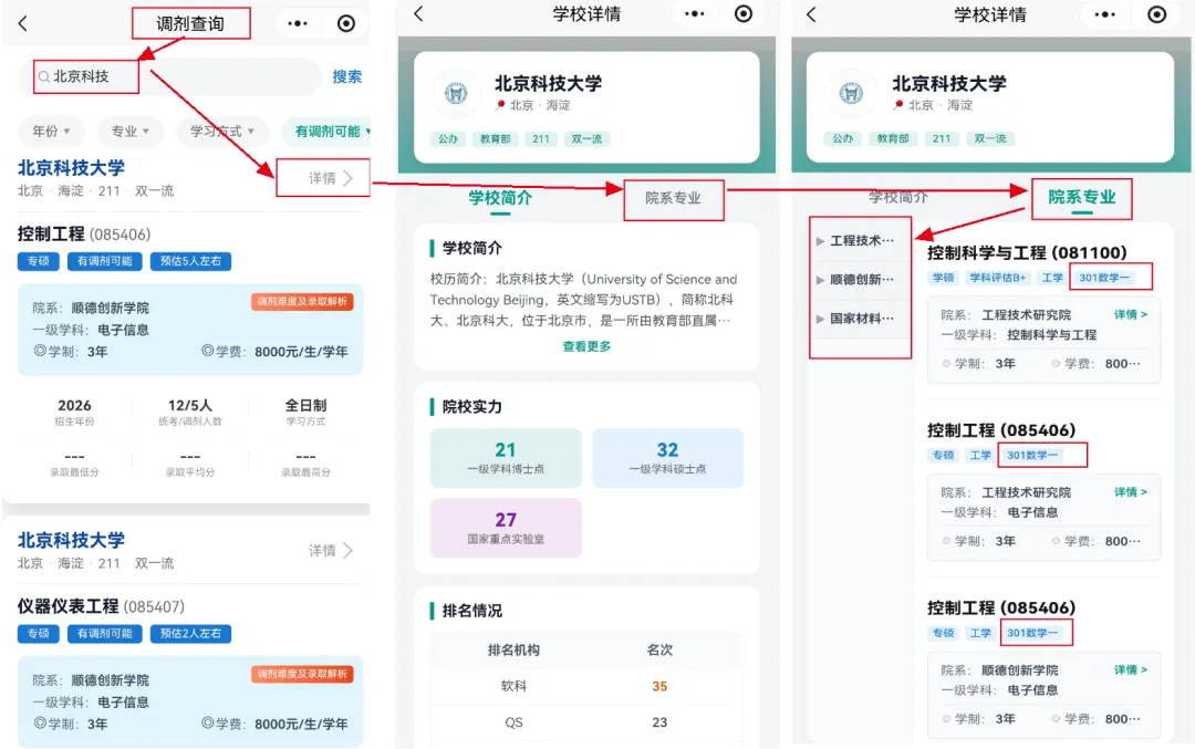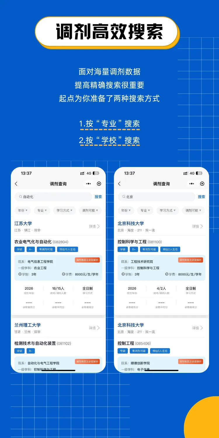 全网实时爬取:覆盖100+所开设控制类专业的院校,官方调剂信息、缺额通知、咨询群二维码、招生老师联系方式,一经发布,小程序第一时间推送,让你永远比别人早知道。