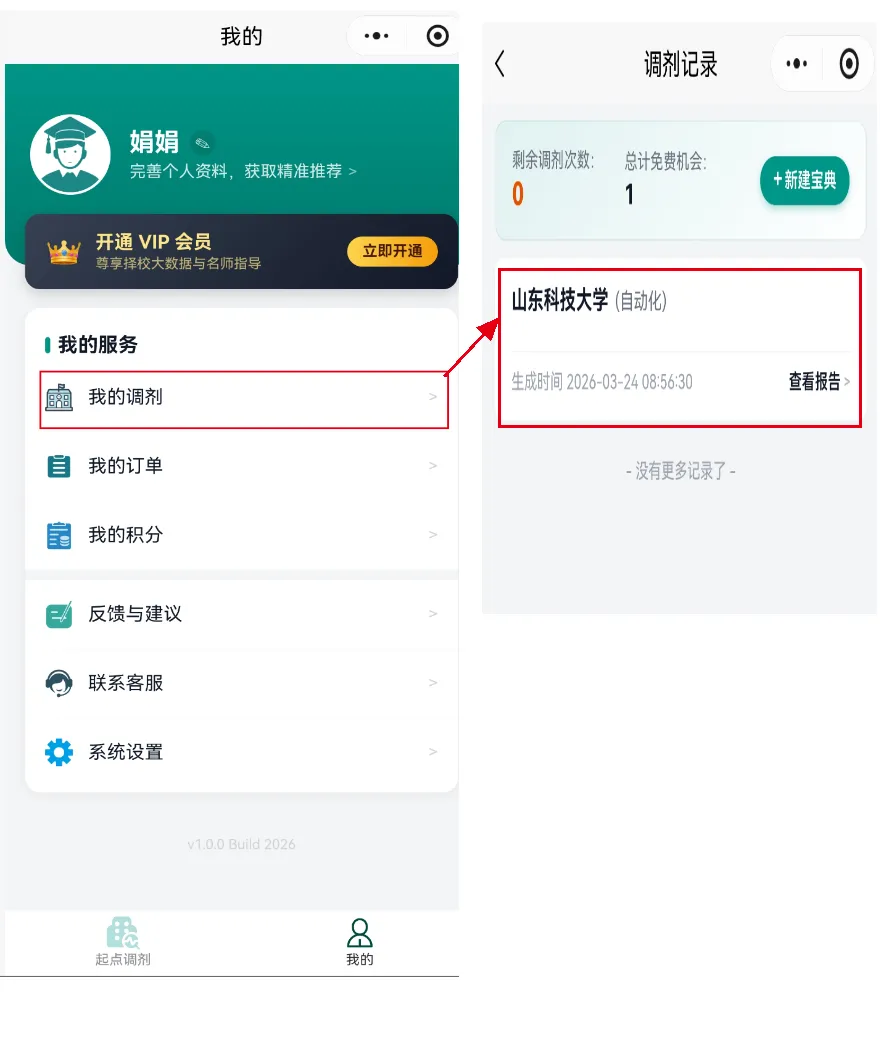 3、学员提交的历史调剂报告,可在“我的”一“我的调剂"进行反复查看;(历史报告也会随着调剂院校的增减补充更新而自动更新哦)