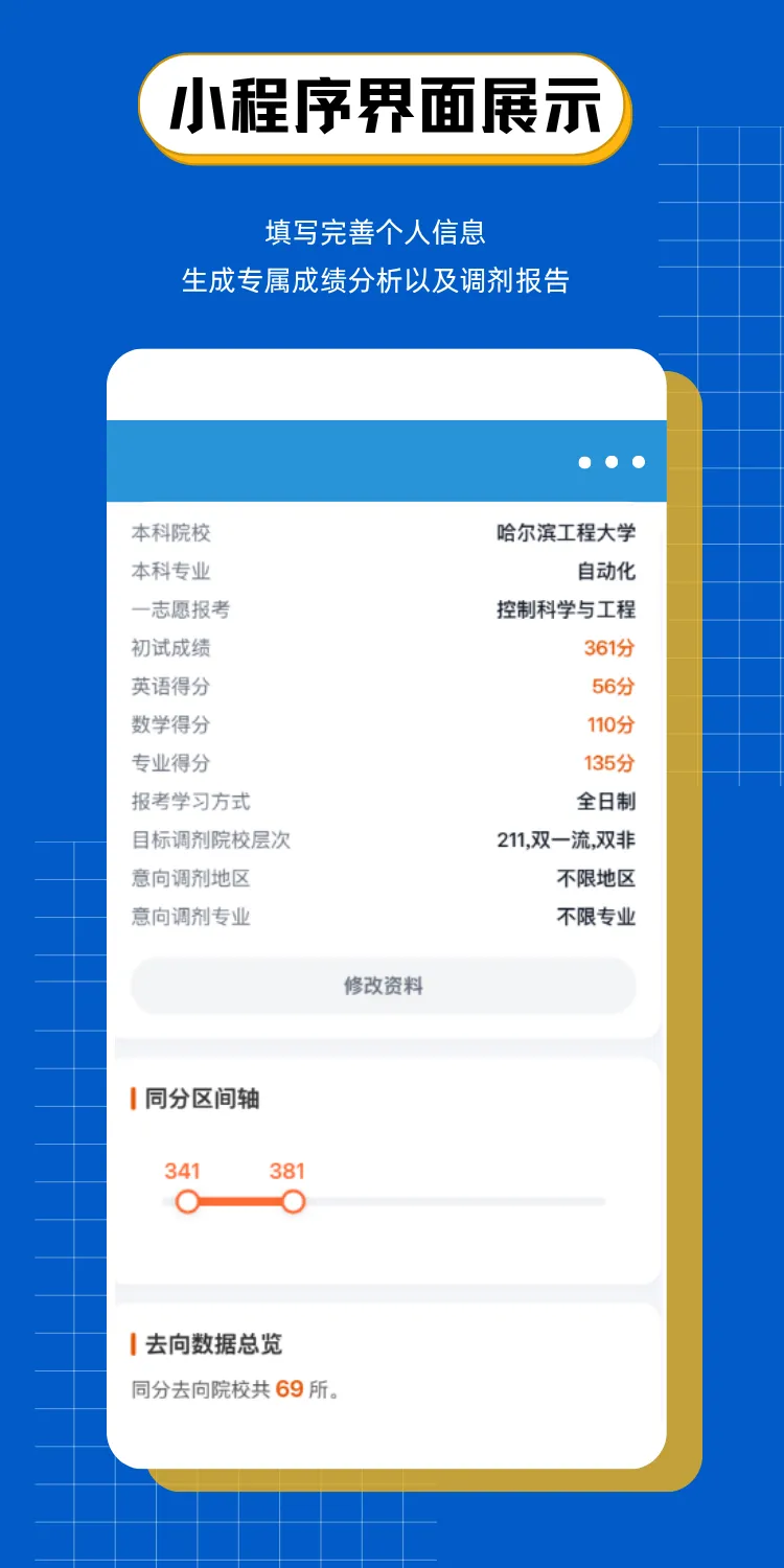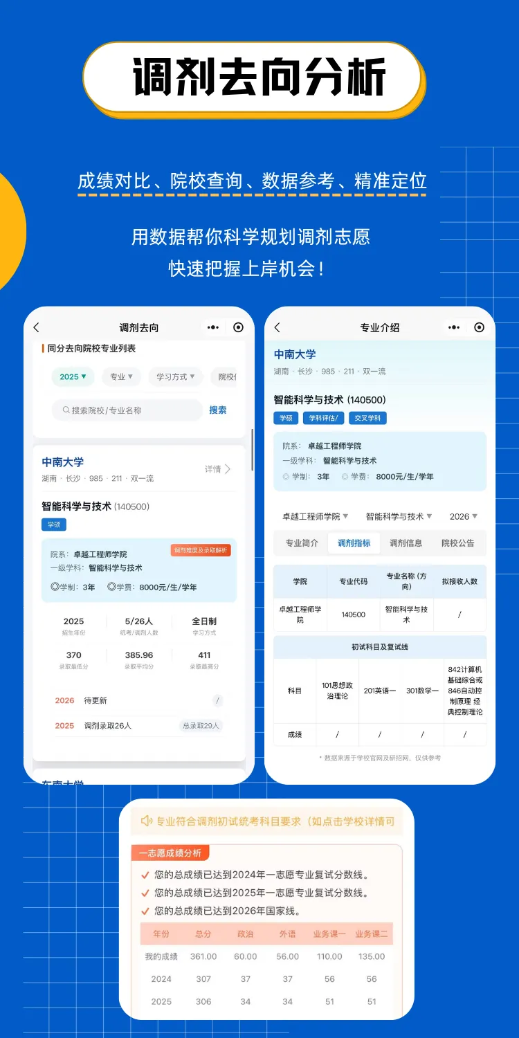 与其坐在家里焦虑内耗,不如用专业工具摸清调剂局势、找准上岸赛道!专为控制类考研调剂打造的控制调剂小程序,精准针对今年高分扎堆的调剂现状,用碾压级的信息优势、科学的匹配模型、独家的数据分析,从信息获取到志愿填报,再到复试备考,全流程帮你在高分大军中精准突围,把上岸的主动权牢牢握在手里!