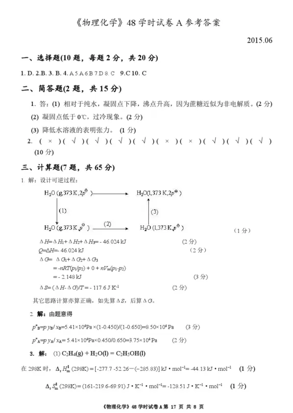 2015年华南理工大学629物理化学(一)考研真题答案解析