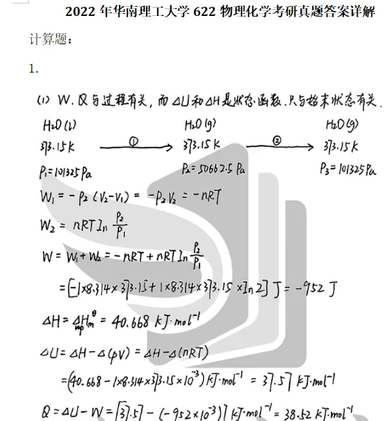 2018年华南理工大学629物理化学(一)考研真题答案解析