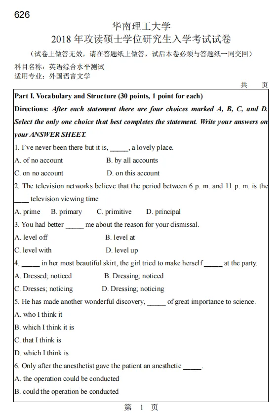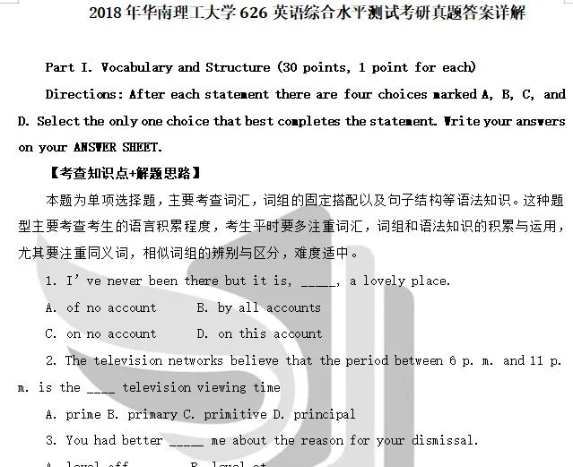 2011-2018年华南理工大学625英语综合水平测试考研真题答案详解