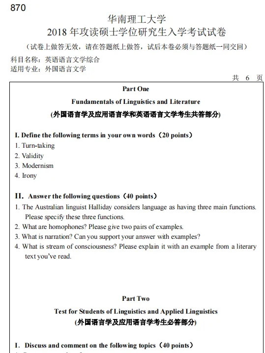 2004-2018,2022年华南理工大学828英语语言文学综合(原870语言学和英美文学基础知识)考研真题试卷