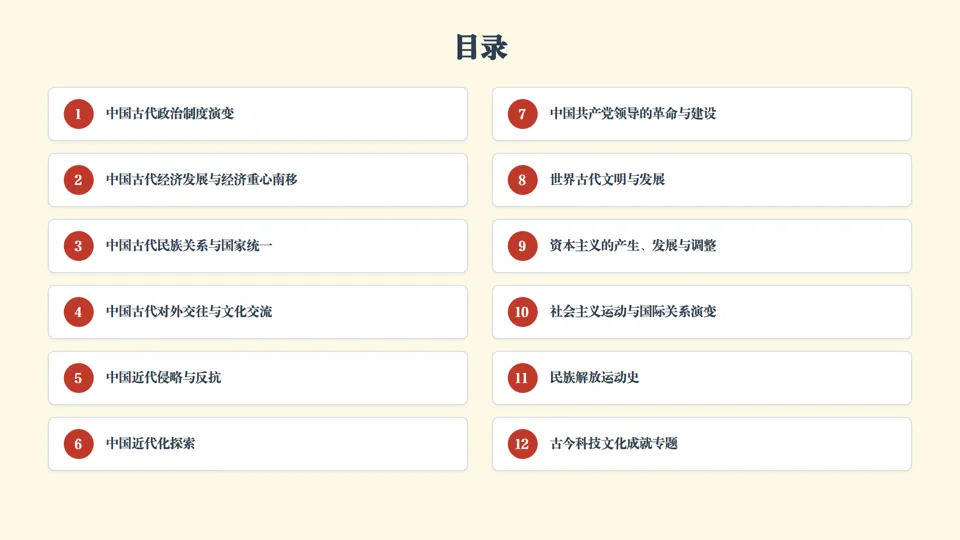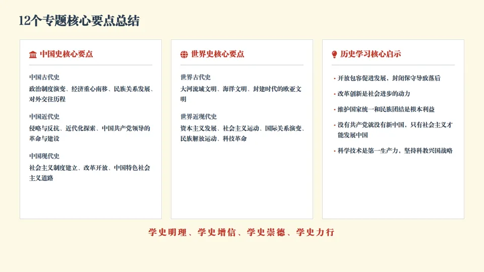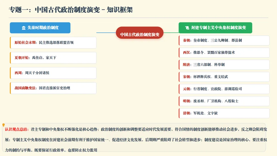 ★认识观点总结 •中国古代政治制度演变核心趋势是君主专制和中央集权不断强化,反映统一多民族国家巩固发展需求 •制度创新要适应时代发展,符合国情的制度创新推动社会进步,反之阻碍发展 •专制主义中央集权制度前期有利于国家统一和经济文化发展,后期严重阻碍社会转型 •制度建设是国家治理核心,要注重权力制约平衡,兼顾行政效率与权力监督 |