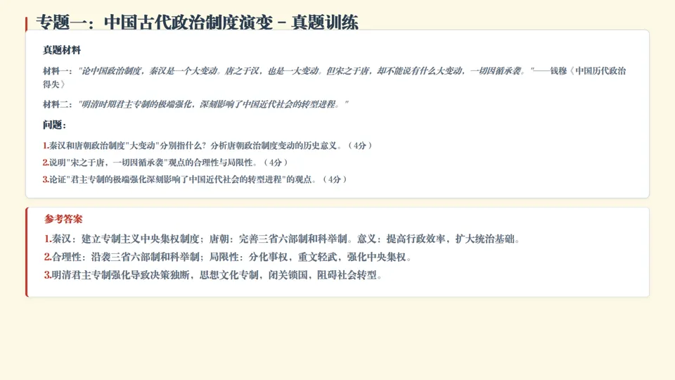 真题演练 (材料分析题,12分)阅读材料,完成下列要求。材料一:"论中国政治制度,秦汉是一个大变动。唐之于汉,也是一大变动。但宋之于唐,却不能说有什么大变动,一切因循承袭。有变动的,只是迫于时代,迫于外面一切形势,改头换面,添注涂改地在变。纵说它有变动,却不能说它有建立。" ——钱穆《中国历代政治得失》材料二:"明清时期政治制度的演变呈现出与前代截然不同的特征,君主专制的极端强化既是传统政治制度发展的必然结果,也深刻影响了中国近代社会的转型进程。" ——摘编自张帆《中国古代简史》问题:1. 结合所学知识,说明材料一中秦汉和唐朝政治制度"大变动"分别指什么?分析唐朝政治制度变动的历史意义。(4分)2. 结合宋代中央官制的调整,说明"宋之于唐,却不能说有什么大变动,一切因循承袭"这一观点的合理性与局限性。(4分)3. 结合明清时期的相关史实,论证材料二中"君主专制的极端强化深刻影响了中国近代社会的转型进程"的观点。(4分) 参考答案:1. 秦汉:建立专制主义中央集权制度(皇帝制度、三公九卿制、郡县制);唐朝:完善三省六部制和科举制。(2分)意义:三省六部制削弱相权,加强皇权,提高行政效率;科举制扩大统治基础,提高官员文化素质,促进社会阶层流动。(2分)2. 合理性:宋代基本沿袭唐代中央官制框架,仍实行三省六部制,科举制进一步发展。(2分)局限性:宋代在沿袭基础上大幅调整,通过分化事权削弱相权、加强地方控制,形成重文轻武政治特色,极大强化中央集权,与唐代制度有显著差异。(2分)3. 论证:明朝废丞相、设内阁,清朝设军机处,君主专制达到顶峰,决策独断随意,易出现失误;(2分)思想文化上实行八股取士、文字狱,压制创新精神,阻碍科技文化发展;对外实行闭关锁国,使中国逐渐落后于世界潮流,为近代被动挨打埋下隐患。(2分) |